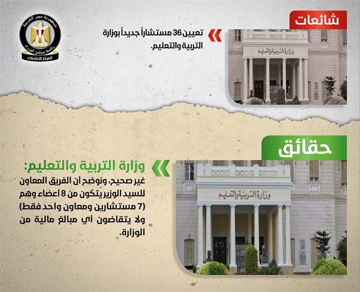 والتعليم الفني، والتي نفت تلك الأنباء تمامًا، مُؤكدًة أنه لا صحة لتعيين 36 مستشارًا