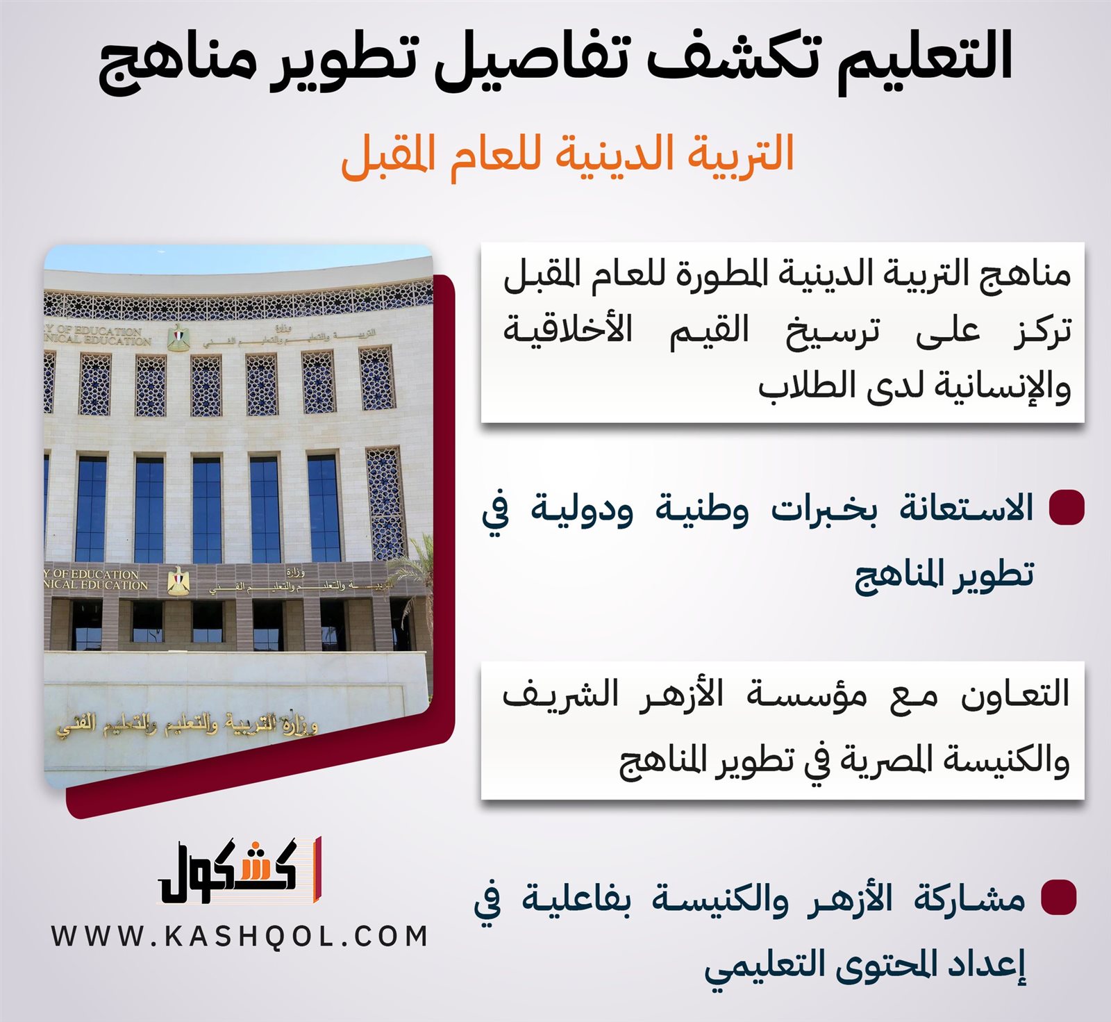 «التعليم» تكشف تفاصيل تطوير مناهج التربية الدينية للعام المقبل «انفوجراف»