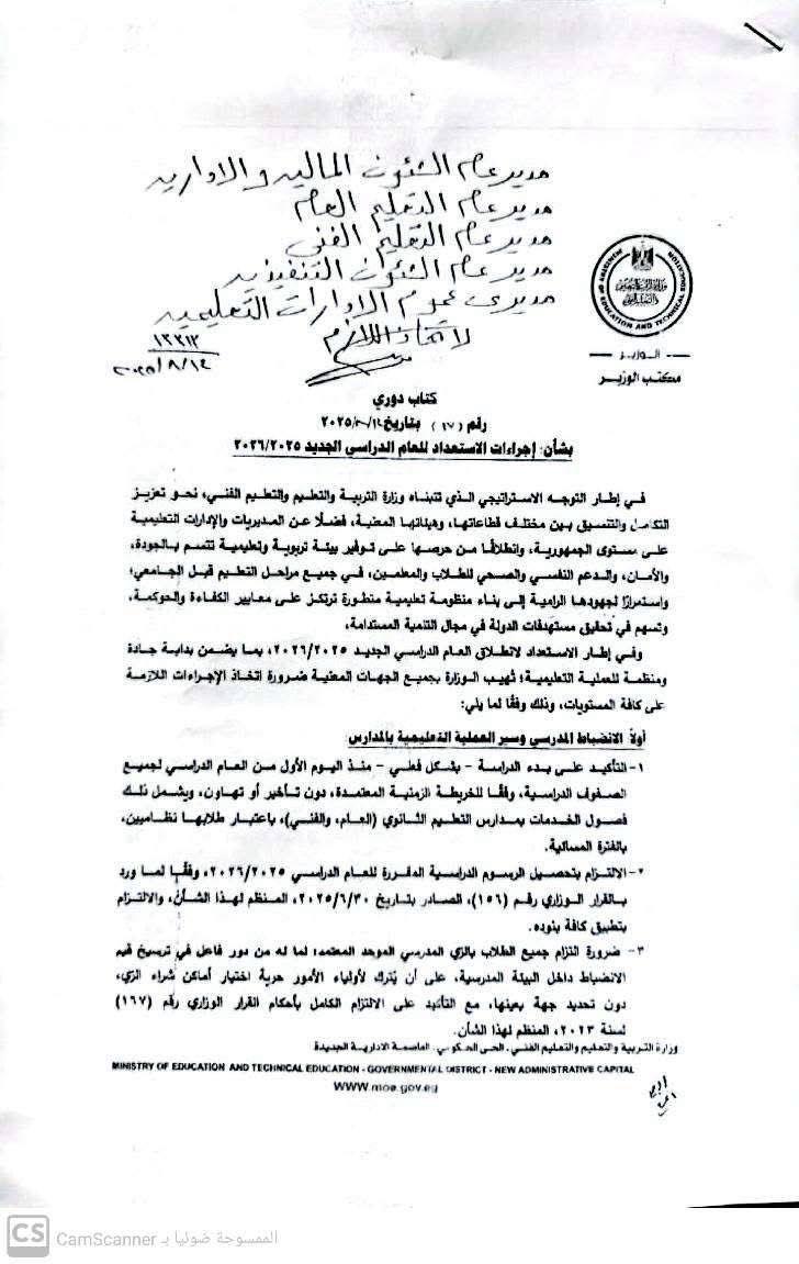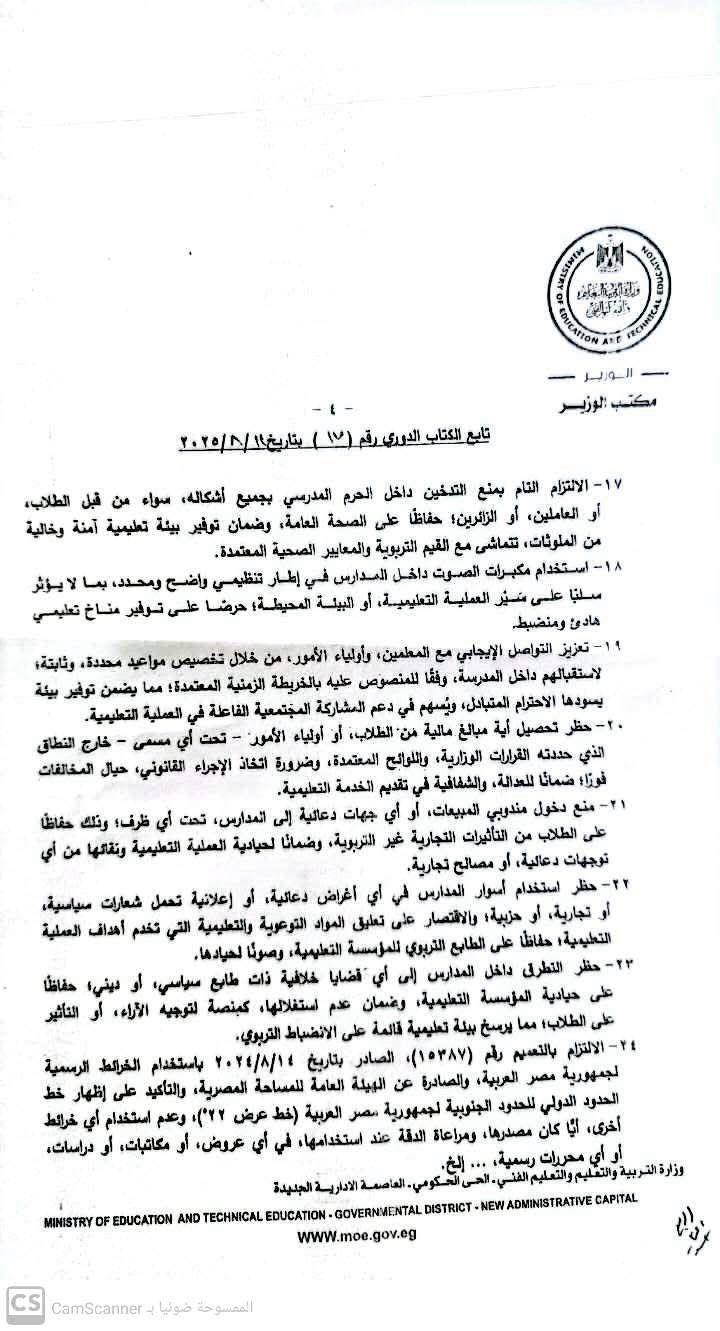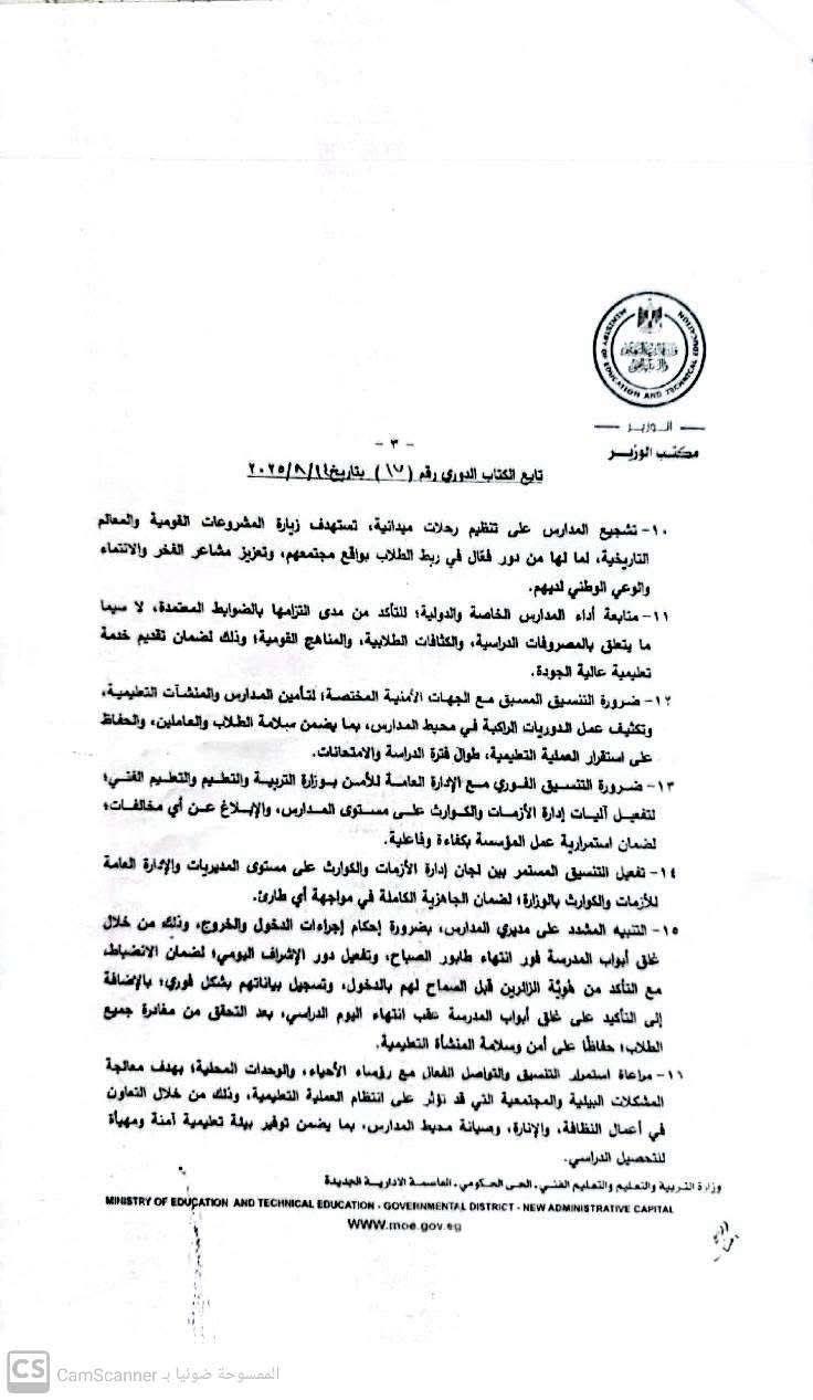 وأصدرت وزارة التربية والتعليم، كتابا دوريا بشأن إجراءات الاستعداد للعام الدراسي الجديد، في إطار التوجه الاستراتيجي الذي تتبناه وزارة التربية والتعليم والتعليم الفني، نحو تعزيز التكامل والتنسيق بين مختلف قطاعاتها، وهيئاتها المعنية، فضلا عن المديريات والإدارات التعليمية على مستوى الجمهورية، وانطلاقا من حرصها على توفير بيئة تربوية وتعليمية تتسم بالجودة والأمان، والدعم النفسي والصحي للطلاب والمعلمين في جميع مراحل التعليم قبل الجامعي واستمرارا لجهودها الرامية إلى بناء منظومة تعليمية متطورة ترتكز على معايير الكفاءة والحوكمة.