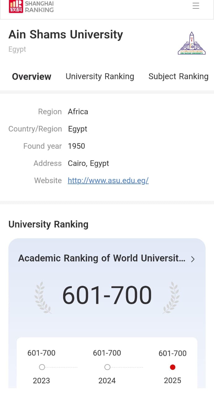 جامعة عين شمس ضمن أفضل ٧٠٠ جامعة حول العالم وفق تصنيف شنغهاي لعام ٢٠٢٥