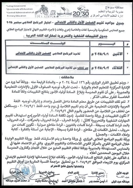 أعلنت مديرية التربية والتعليم والتعليم الفني بمحافظة سوهاج، جدول مواعيد تقييم الصفين الأول والثاني الابتدائي - اجتياز البرنامج العلاجي سبتمبر ٢٠٢، لجميع المدارس الحكومية والرسمية لغات والخاصة عربي ولغات ) لإجراء التقييم النهائي لاجتياز البرنامج العلاجي