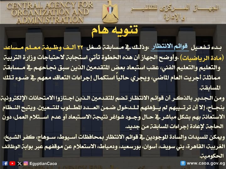 أعلن الجهاز المركزي للتنظيم والإدارة،  بدء تفعيل قوائم الانتظار، وذلك في مسابقة شغل ۲۲ ألف وظيفة معلم مساعد مادة الرياضيات).