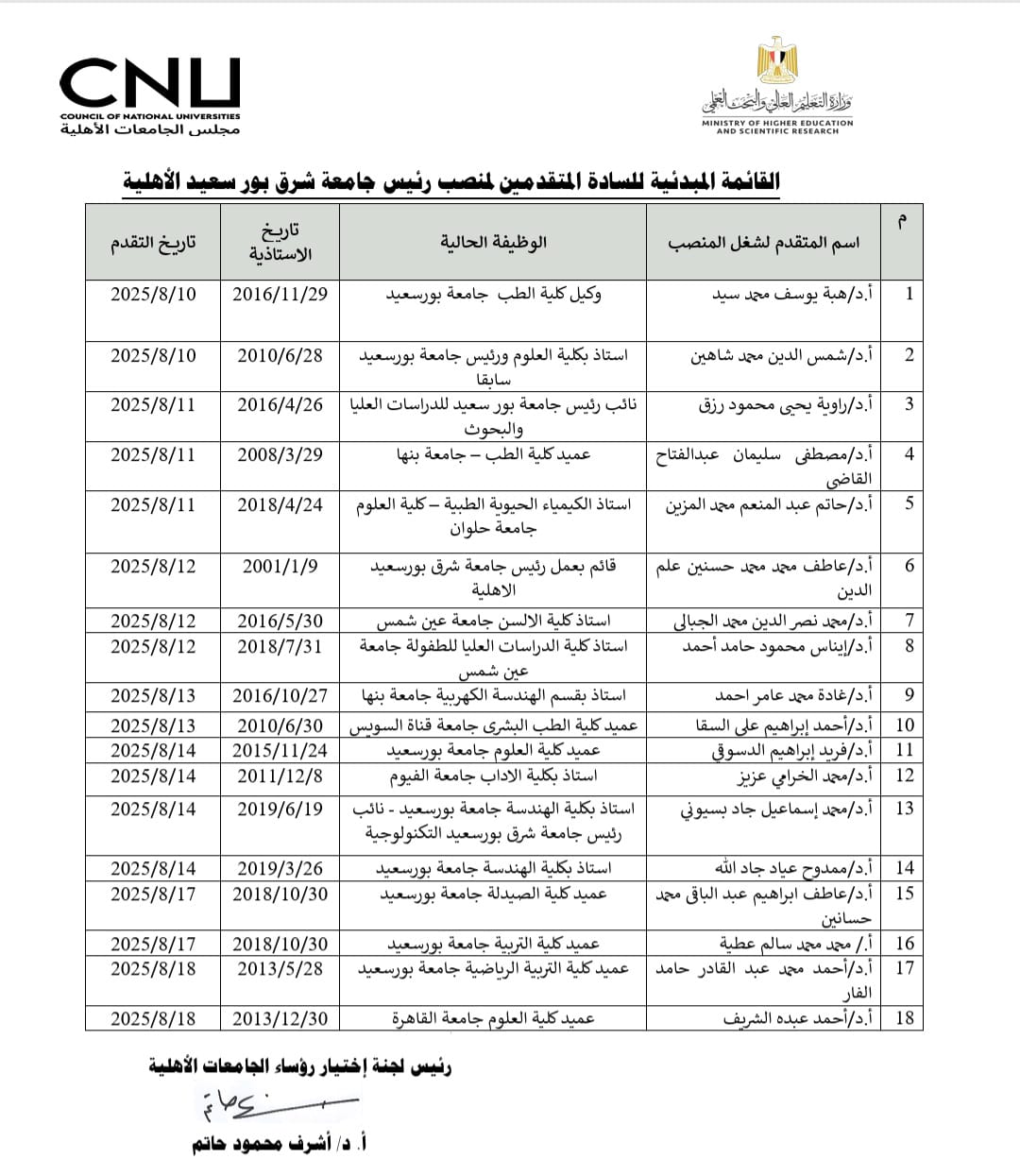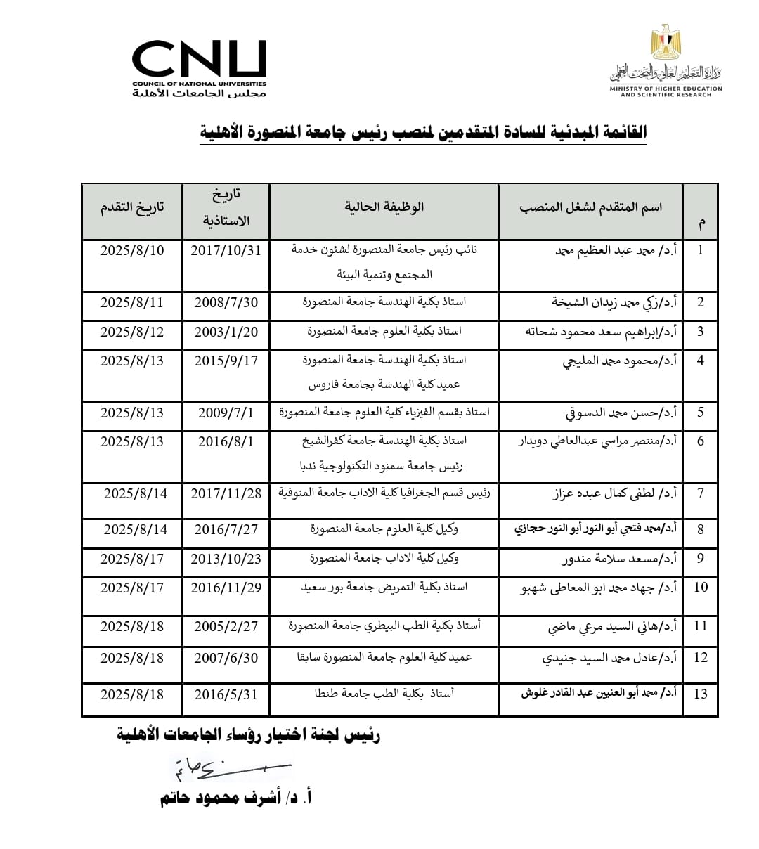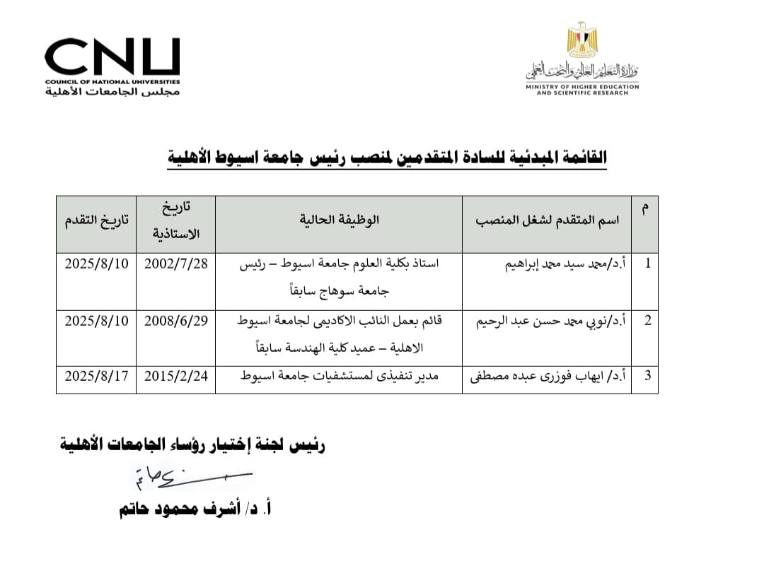 القائمة المبدئية للمرشحين لمنصب رؤساء خمس جامعات أهلية