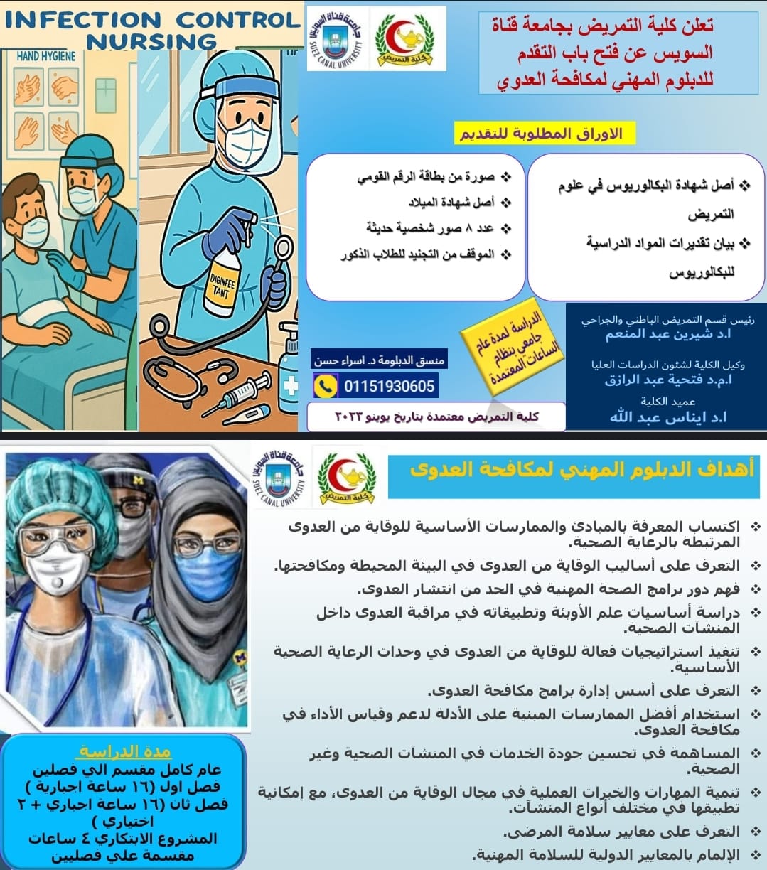 أعلنت كلية التمريض جامعة قناة السويس عن فتح باب القبول لأول مرة ببرنامج الدبلوم المهني لمكافحة العدوى للعام الجامعي الجديد، تحت رعاية وإشراف الدكتور ناصر مندور رئيس جامعة قناة السويس، وبإشراف عام من الدكتور محمد سعد زغلول نائب رئيس جامعة قناة السويس لشئون الدراسات العليا والبحوث، وإشراف الدكتورة إيناس عبدالله عميد كلية التمريض جامعة قناة السويس، والإشراف التنفيذي للدكتورة فتحية عبدالرازق وكيل الكلية لشئون الدراسات العليا، والدكتورة شيرين عبدالمنعم رئيس قسم التمريض الباطني والجراحي.
