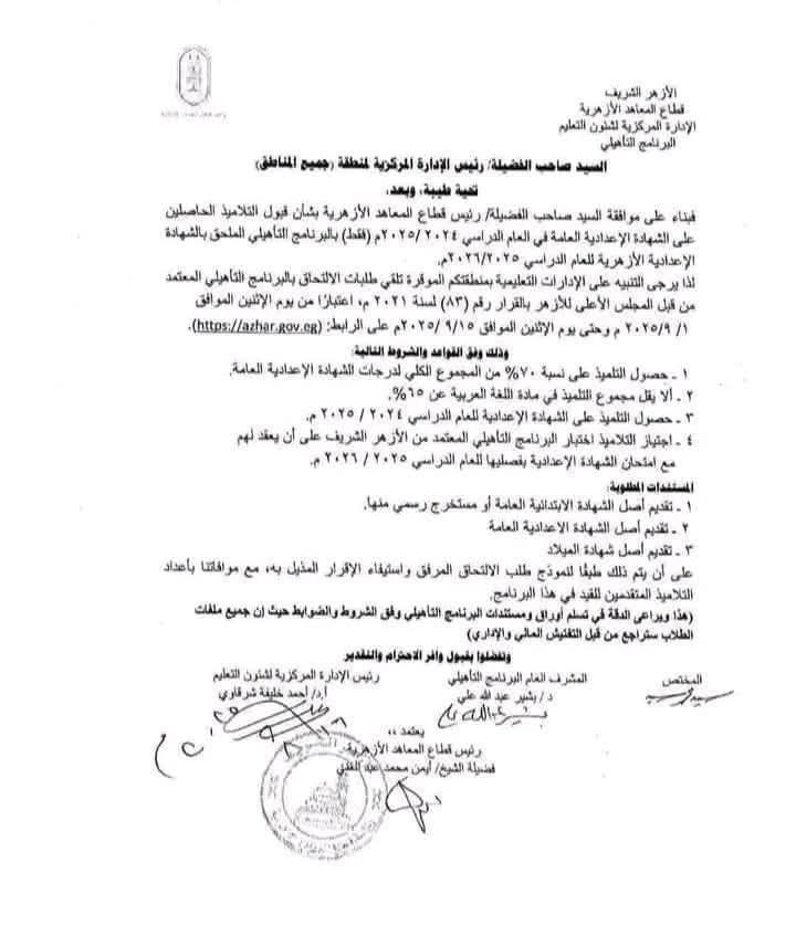 • اجتياز التلاميذ اختبار البرنامج التأهيلي المعتمد من الأزهر الشريف على أن يعقد لهم مع امتحان الشهادة الإعدادية بفصليها العام الدراسي ٢٠٢٥ / ٢٠٢٦ م.