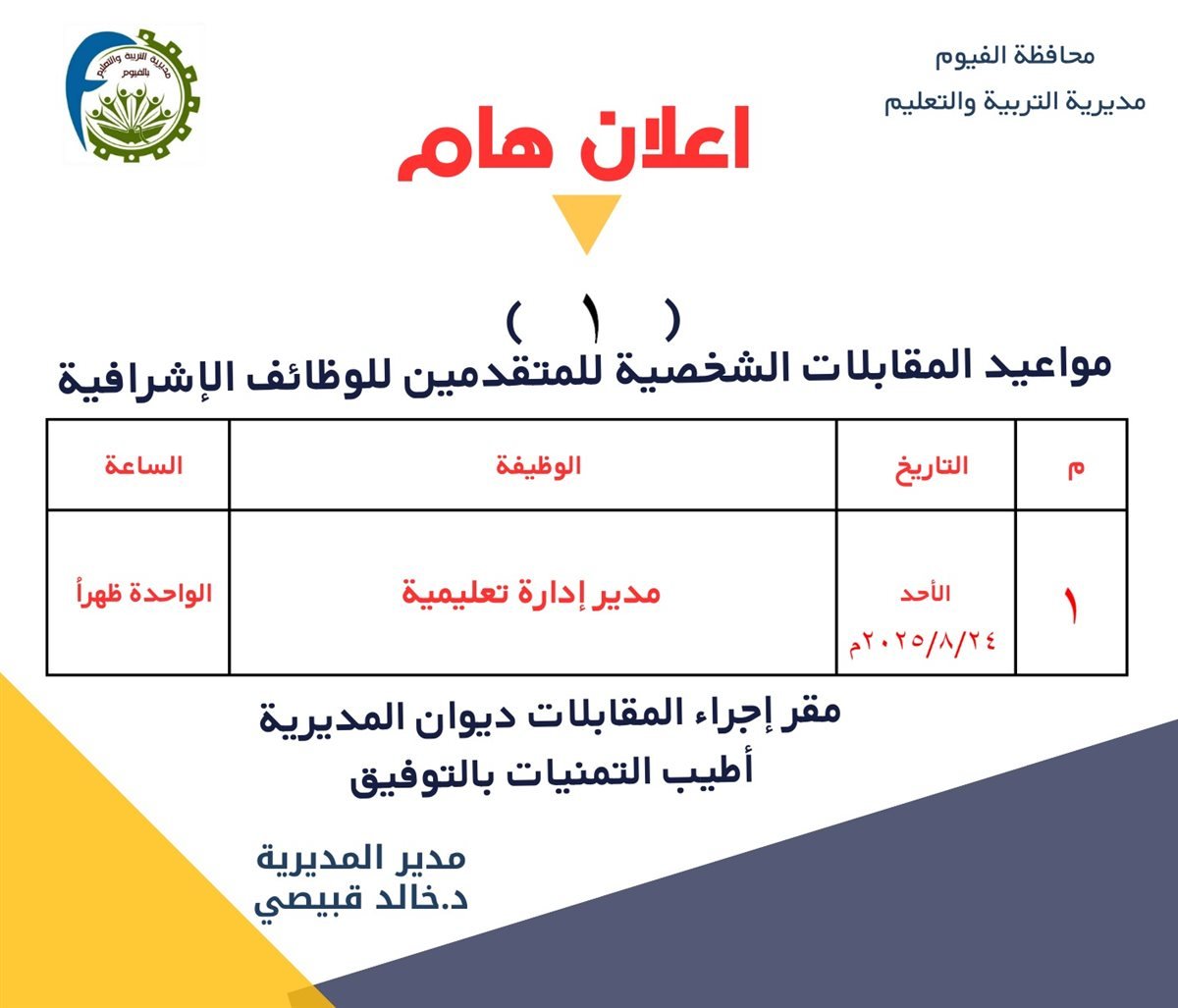 أعلنت مديرية التربية والتعليم بالفيوم، أن لجنة اختيار القيادات تبدأ المقابلات الشخصية للمتقدمين للوظائف الإشرافية، الأحد المقبل، للمتقدمين لوظيفة مدير إدارة تعليمية، وتعقد اللجنة جلساتها بمقر مديرية التربية والتعليم.