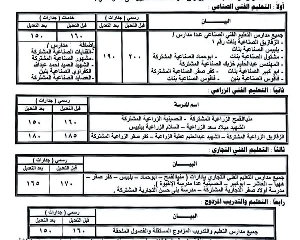 كما قرر المحافظ النزول بالحد الأدنى لتنسيق القبول بالصف الأول الثانوي الفني ( الصناعي – الزراعي – التجاري – التعليم والتدريب المزدوج)  بعدد من المدارس بنطاق المحافظة طبقا للكشف المرفق.