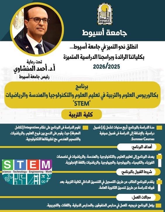 وفي هذا الإطار، تواصل كلية التربية جامعة أسيوط تقديم برنامج "بكالوريوس العلوم والتربية في تعليم العلوم والتكنولوجيا والهندسة والرياضيات (STEM)"، والذي يُعد من البرامج الرائدة بالكلية، ويستهدف إعداد معلمين متخصصين في تدريس الفيزياء والكيمياء والبيولوجيا والجيولوجيا والرياضيات باللغة الإنجليزية.