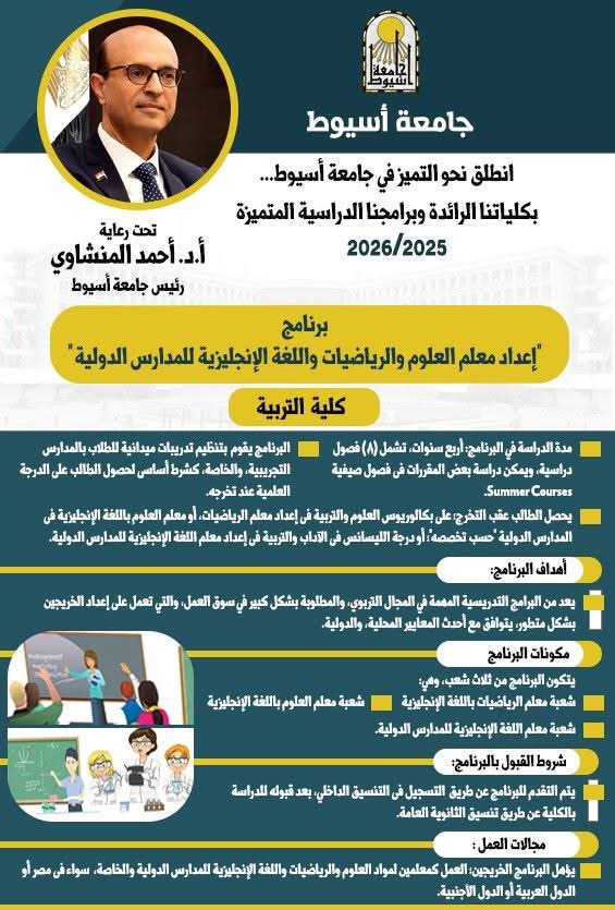 وفي هذا الإطار، تقدم كلية التربية جامعة أسيوط، برنامج "إعداد معلم العلوم والرياضيات واللغة الإنجليزية للمدارس الدولية" بنظام الساعات المعتمدة، والذي يُعد من البرامج الرائدة والمطلوبة محليًا ودوليًا في المجال التربوي، ويأتي تحت إشراف كل من: الدكتور أحمد عبد المولى نائب رئيس الجامعة لشئون التعليم والطلاب، والدكتور حسن حويل عميد كلية التربية، والدكتور شرين عبد المحسن منسق البرنامج.