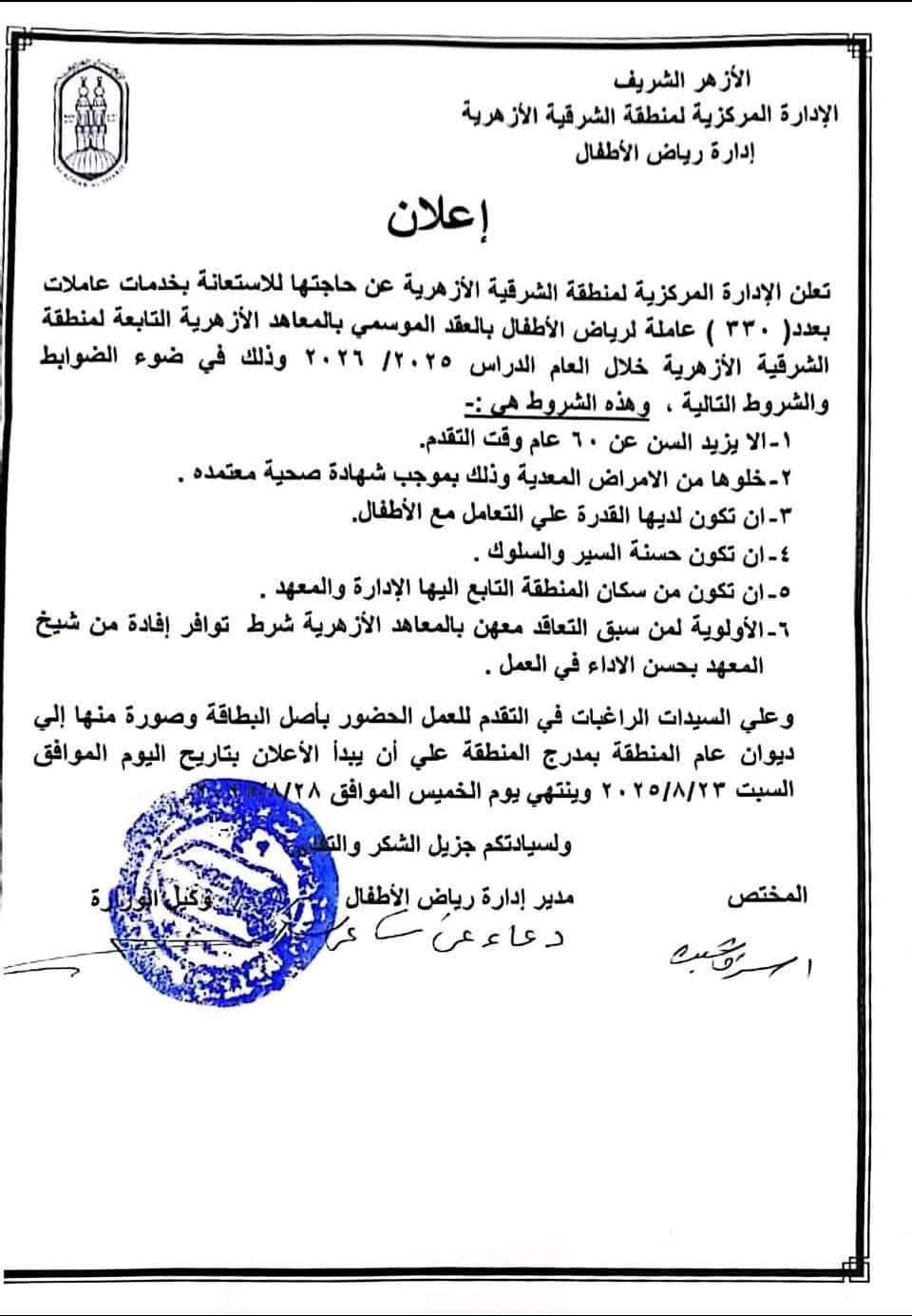أعلنت الإدارة المركزية لمنطقة الشرقية الأزهرية عن حاجتها للاستعانة بخدمات عاملات بعدد ( ۳۳۰ ) عاملة لرياض الأطفال بالعقد الموسمي بالمعاهد الأزهرية التابعة لمنطقة الشرقية الأزهرية خلال العام الدراسي ۲۰۲۵/ ۲۰۲۶ وذلك في ضوء الضوابط والشروط التالية:-