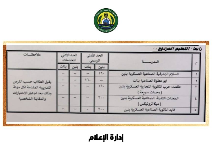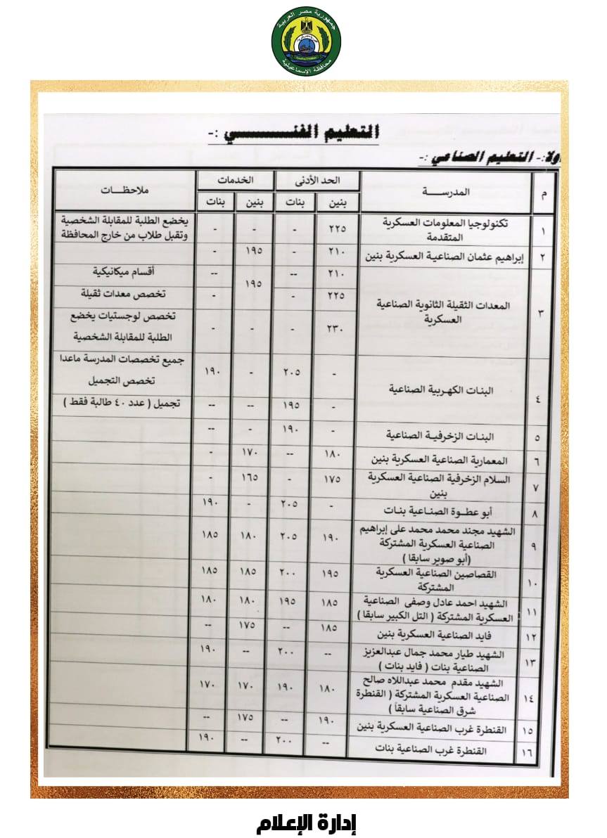 وأكد أنه طبقًا للجدول المرفق تم اعتماد درجات القبول بالمرحلة الثانية لتنسيق المدارس الفنية التجارية والزراعية والصناعية بكافة مدارس المحافظة، وذلك بعد دراسة الإحصاء التكراري للناجحين بالدور الثاني لتكون الحد الأدنى للقبول بالمدارس الثانوية الفنية وبفصول الخدمات.