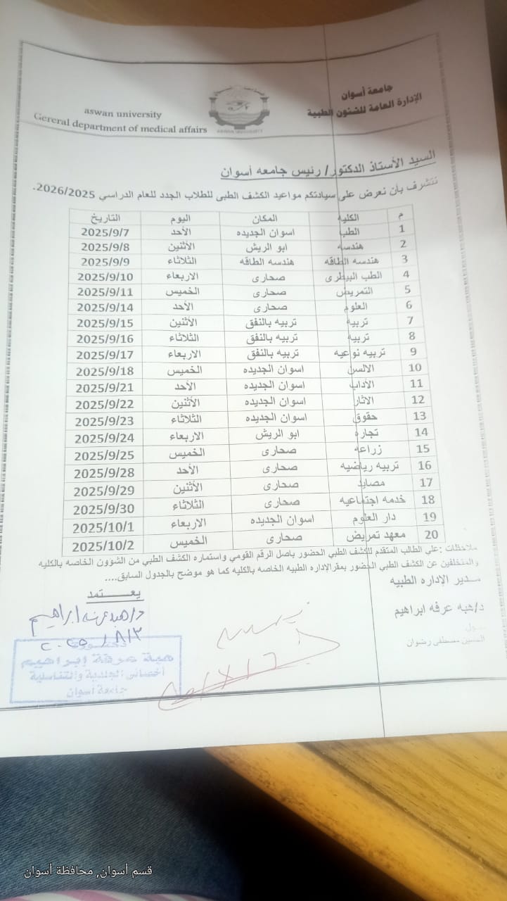 المستندات المطلوبة للكشف الطبي جامعة أسوان