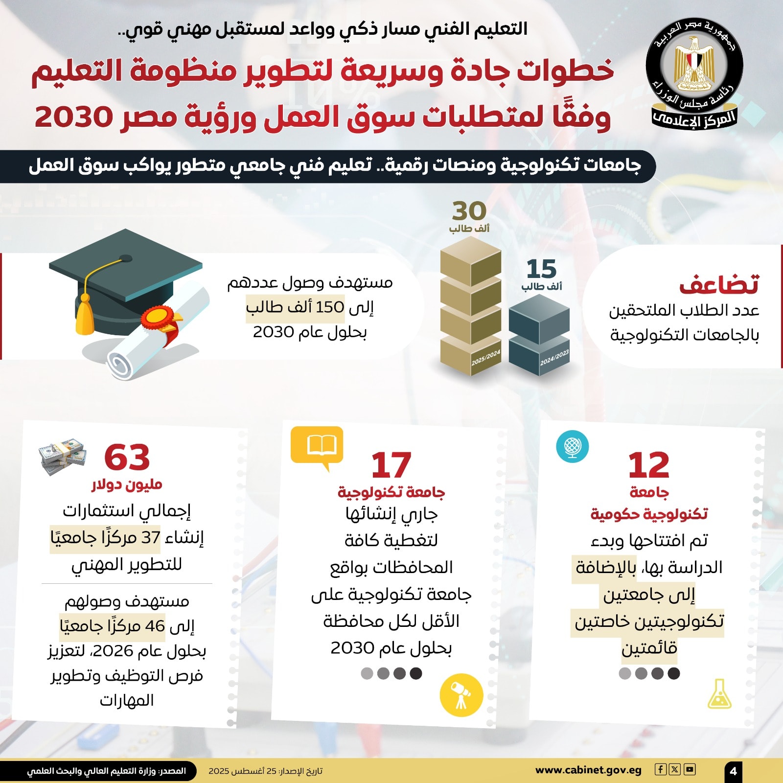 نشر المركز الإعلامي لمجلس الوزراء عددًا من الإنفوجرافات عبر منصاته على مواقع التواصل الاجتماعي، استعرض من خلالها الخطوات الجادة والسريعة لتطوير منظومة التعليم الفني وفقًا لمتطلبات سوق العمل ورؤية مصر 2030، باعتباره مسار ذكي وواعد لمستقبل مهني قوي.