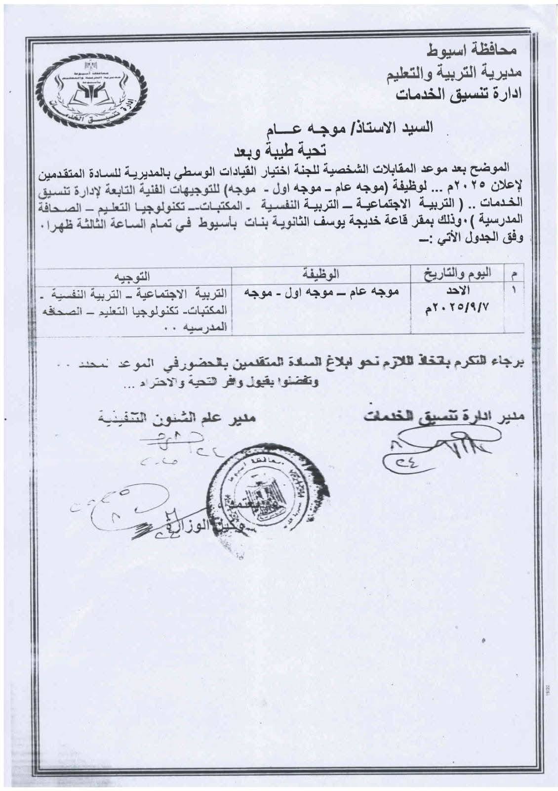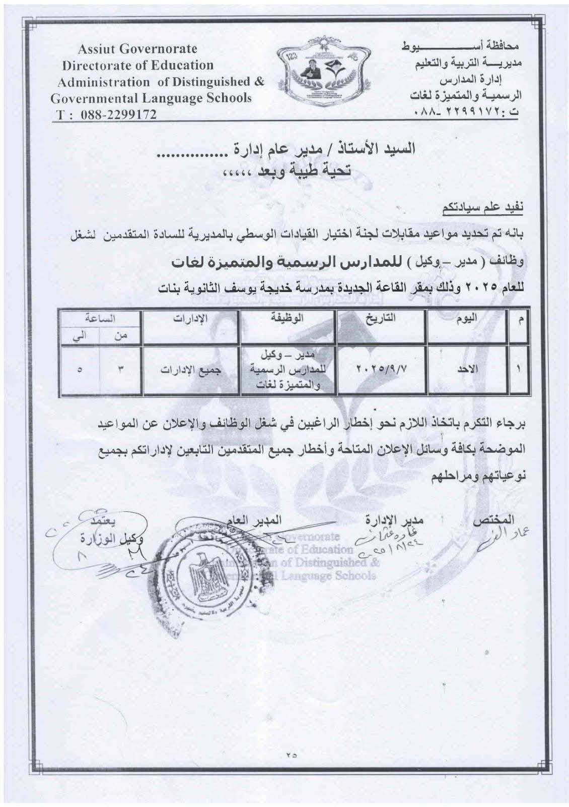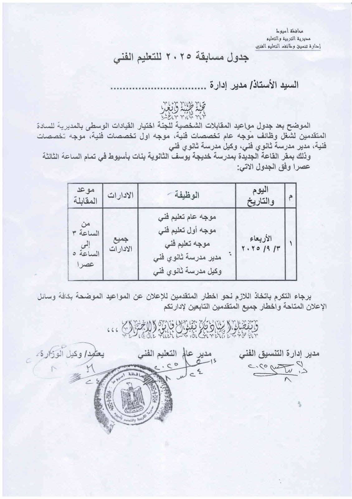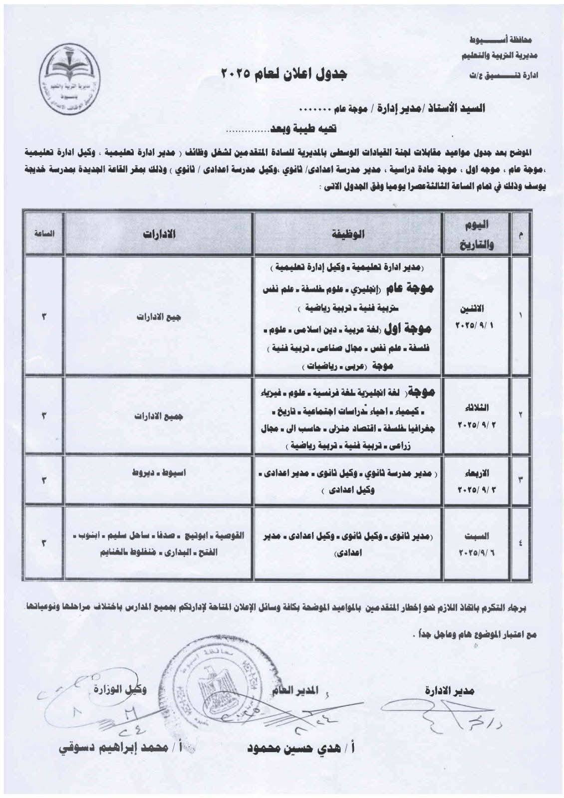 أعلن محمد إبراهيم دسوقى وكيل وزارة التربية والتعليم بأسيوط، جدول مقابلات لجنة اختيار القيادات الوسطى بالمديرية لـ المرشحين لشغل وظائف مدير ادارة تعليمية ووكيل ادارة وموجه عام وموجه اول وموجه مادة ومدير مدرسة إعدادى - ثانوى، ذلك بمقر قاعة الاجتماعات الكبرى المجاورة لمدرسة الخديجة يوسف الثانوية بنات بحى شرق وذلك ابتداء من يوم الاثنين الموافق 1 سبتمبر وحتى يوم الأحد 7 سبتمبر ٢٠٢٥ من الساعة الثالثة عصرا وحتى الخامسة عصرا وفقا للجدول المعلن والذى تم توزيعه على كافة الإدارات التعليمية والمدارس.