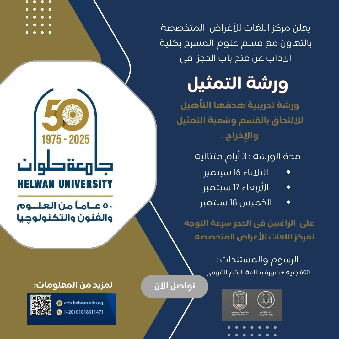 أعلن مركز اللغات للأغراض المتخصصة بكلية الآداب جامعة حلوان بالتعاون مع قسم علوم المسرح عن فتح باب التسجيل في ورشة تدريبية جديدة بعنوان "ورشة التمثيل"، والمقرر إقامتها خلال شهر سبتمبر المقبل، وذلك في إطار حرص جامعة حلوان على دعم المواهب الطلابية وتنمية القدرات الإبداعية لدى طلابها.
