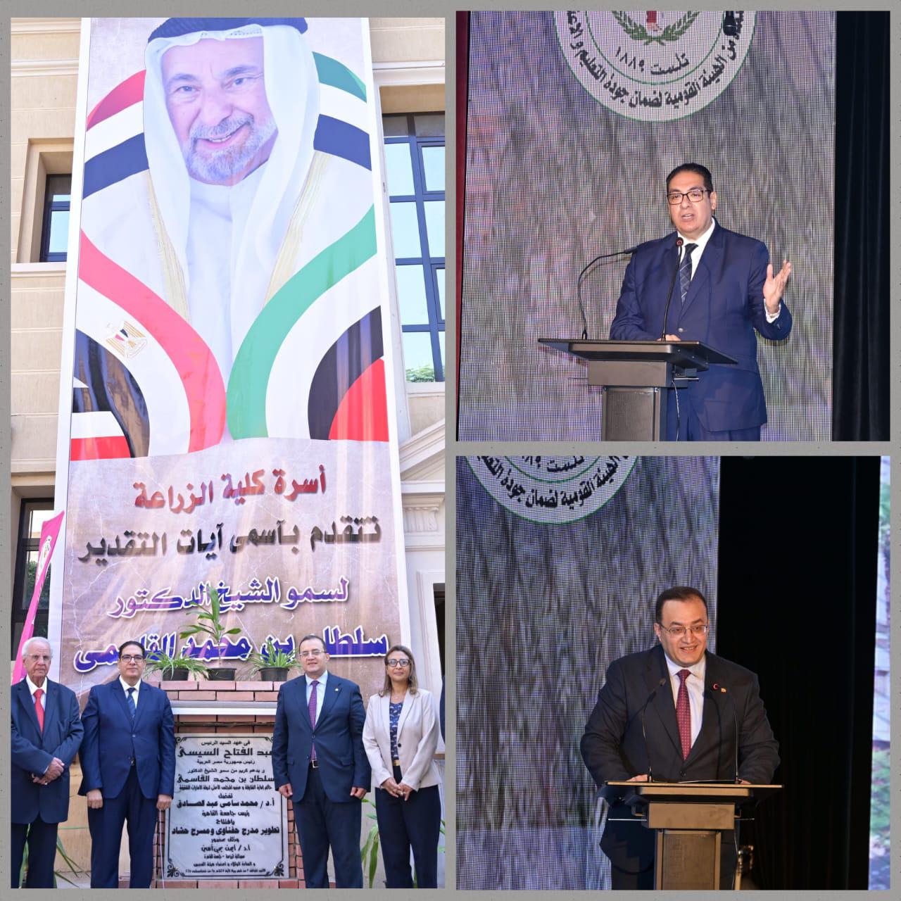 ووجه رئيس جامعة القاهرة، الشكر لسمو الشيخ سلطان القاسمي حاكم إمارة الشارقة لدعمه الكريم لجامعة القاهرة بوجه عام وكلية الزراعة خاصة كونه احد أبرز خريجيها، وأضاف أن ما يقدمه الشيخ القاسمي ليس مجرد دعم مادي، بل هو تجسيد لمعنى الانتماء الأصيل ورسالة إنسانية وحضارية تؤكد أن جامعة القاهرة حاضرة دائمًا في قلب وعقل أبنائها، وصرحًا شامخًا للعلم والمعرفة يستمد قوته من وفائهم وعطائهم.