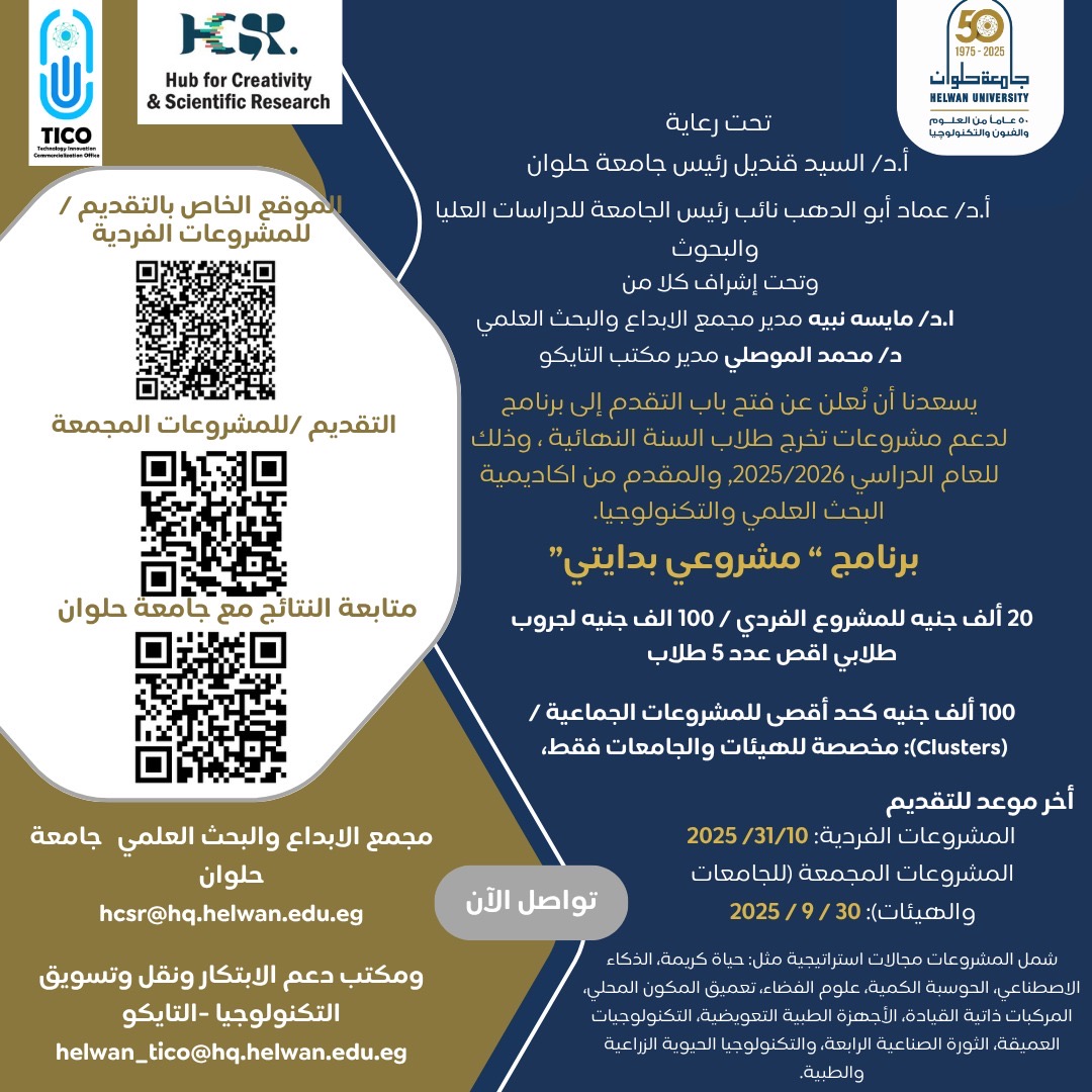 أعلنت جامعة حلوان عن فتح باب التقدم إلى برنامج "مشروعي بدايتي"، أحد أهم برامج دعم مشروعات تخرج طلاب السنوات النهائية بالجامعات المصرية، في إطار أنشطة قطاع الدراسات العليا بجامعة حلوان، وذلك للعام الدراسي 2025/2026، والمقدم من أكاديمية البحث العلمي والتكنولوجيا، وذلك تحت رعاية الدكتور السيد قنديل رئيس جامعة حلوان، والدكتور عماد أبو الدهب نائب رئيس الجامعة لشئون الدراسات العليا والبحث العلمي، وإشراف الدكتورة مايسة محمد نبيه مدير مجمع الابداع والبحث العلمي، والدكتور محمد الموصلي مدير مكتب دعم الابتكار ونقل وتسويق التكنولوجيا (التايكوTICO-) بجامعة حلوان.