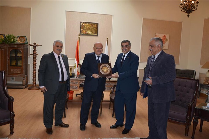 استقبل الدكتور خالد عبد الباري، رئيس جامعة الزقازيق، اليوم، الدكتور حسين محمود المغربي، رئيس جامعة بنها، خلال زيارته للجامعة للمشاركة في مناقشة رسالة دكتوراه في كلية الطب البيطري بعنوان :دور الحمض النووي الدقيق - 155في اصابات الحبل الشوكي وفقر الدم الموضعي والشلل التابعين لإصلاح الشريان الأورطي، حيث أهداه درع جامعة الزقازيق تكريما له وذلك بحضور الدكتور عبد العليم فؤاد، عميد الكلية، والدكتور أحمد السيد بحيري، صراحة استاذ الجراحة ووكيل الكلية لشئون خدمة المجتمع تنمية البيئة.