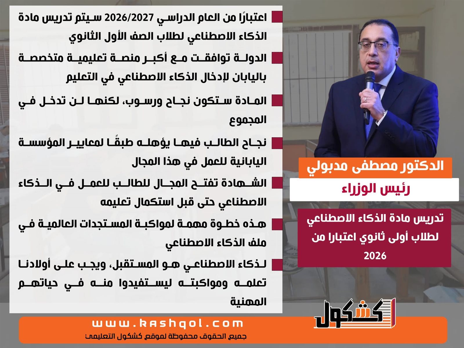 - اعتبارًا من العام الدراسي 2026/2027 سيتم تدريس مادة الذكاء الاصطناعي لطلاب الصف الأول الثانوي