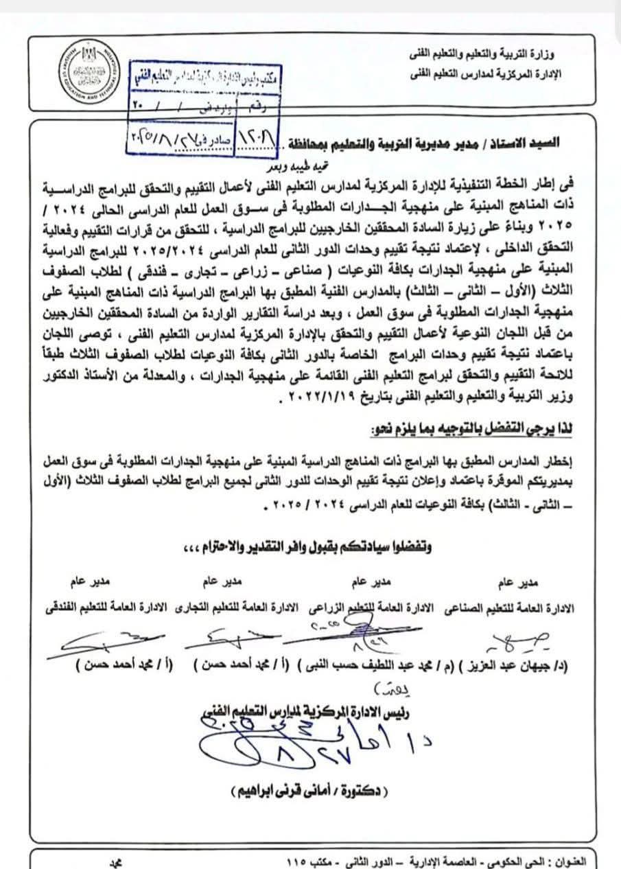 • إخطار المدارس المطبق بها البرامج ذات المناهج الدراسية المبنية على منهجية الجدارات المطلوبة في سوق العمل باعتماد وإعلان نتيجة تقييم الوحدات للدور الثاني لجميع البرامج لطلاب الصفوف الثلاث الأول- الثاني - الثالث) بكافة النوعيات للعام الدراسي ٢٠٢٤ / ٢٠٢٥.