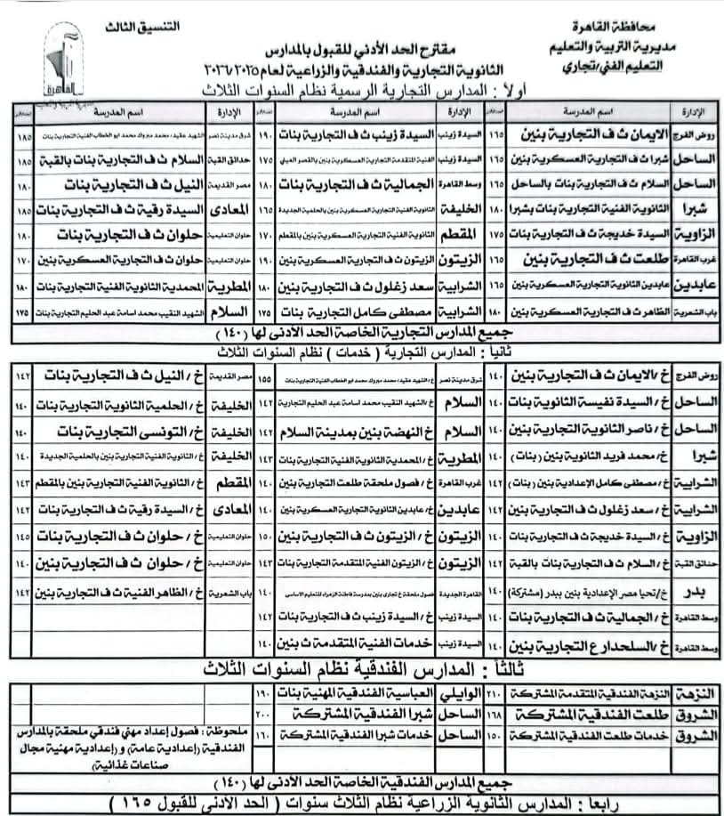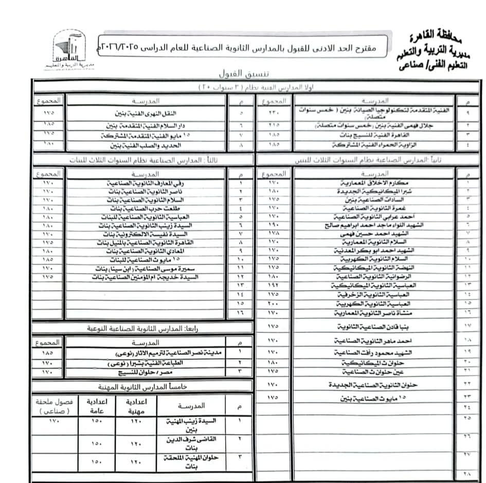 ويمكن الإطلاع على تنسيق الحد الأدني للقبول بمدارس التعليم الفنى( صناعى، تجارى، فندقى، زراعى) للعام الدراسى ٢٠٢٥/ ٢٠٢٦ بمحافظة القاهرة من خلال مطالعة الصور التالية:
