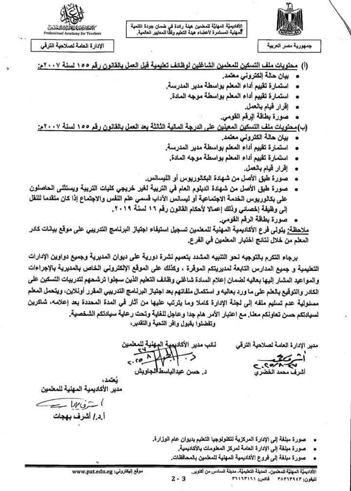 أوضحت الأكاديمية المهنية للمعلمين أنه في إطار تنظيم إجراءات الحصول على شهادة الصلاحية اللازمة للنقل (التسكين) إلى وظائف المعلمين أو ما يقابلها؛ وفي ضوء تنظيم برنامج التنمية المهنية اللازم للحصول على شهادة الصلاحية بالتعاون بين الأكاديمية المهنية للمعلمين والإدارة المركزية لتكنولوجيا التعليم بديوان عام الوزارة، يجب على  شاغلي وظائف التعليم الذين سجلوا ترشحهم لتدريبات التسكين على الكادر بضرورة الالتزام بالإجراءات والتعليمات التي تضمنت الآتي: