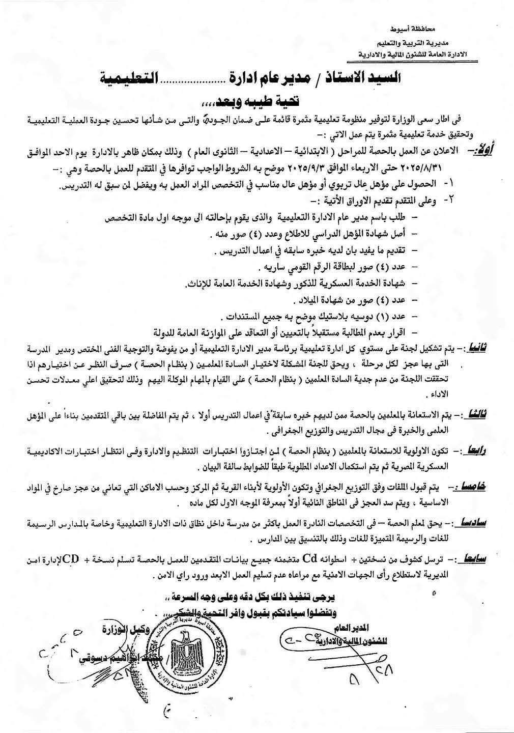 يأتي ذلك، في إطار سعى الوزارة لتوفير منظومة تعليمية مثمرة قائمة على ضمان الجودة والتي من شأنها تحسين جودة العملية التعليمية وتحقيق خدمة تعليمية مثمرة، وذلك من خلال الإعلان عن العمل بالحصة للمراحل ( الابتدائية - الإعدادية - الثانوى العام ( وذلك بمكان ظاهر بالإدارة يوم الأحد الموافق ۲۰٢٥/٨/٣١ حتى الاربعاء الموافق ۲۰۲۵/۹/۳ موضح به الشروط الواجب توافرها في المتقدم للعمل بالحصة وهي:-