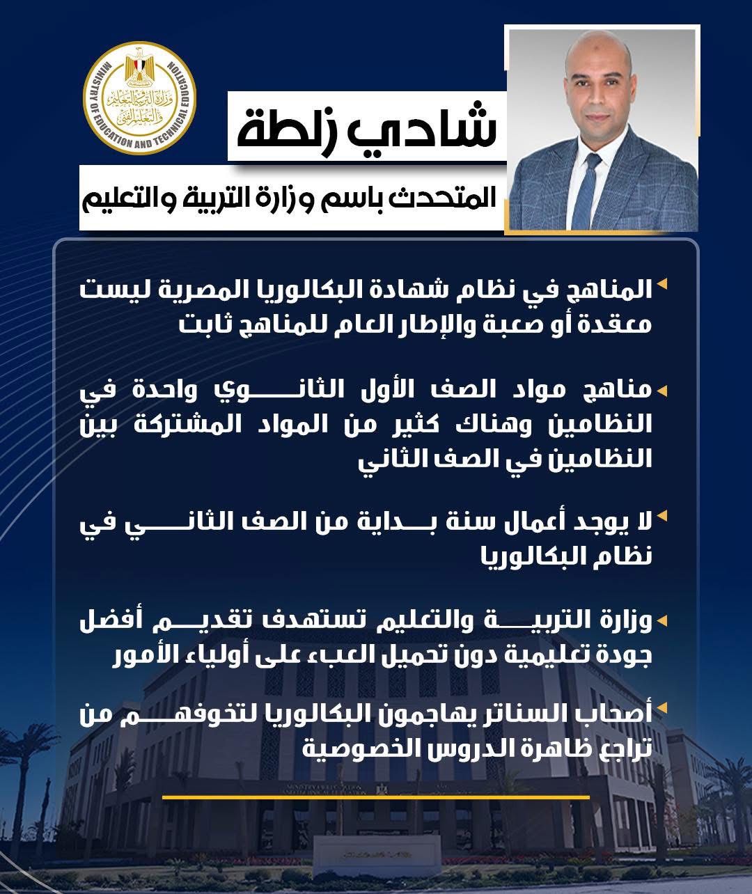 أوضح شادي زلطة المتحدث باسم وزارة التربية والتعليم والتعليم الفني، أن المناهج في نظام شهادة البكالوريا المصرية ليست معقدة أو صعبة، مشيرا إلى أن الإطار العام للمناهج ثابت.