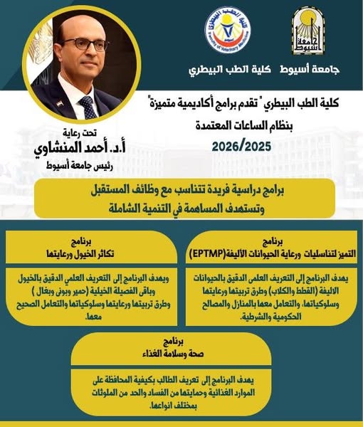 وأكد الدكتور أحمد المنشاوي رئيس جامعة أسيوط، أن البرامج الدراسية التي تطرحها كلية الطب البيطري تستهدف تخصصات دقيقة ونادرة تلبي احتياجات سوق العمل في مجالات الطب البيطري، موضحًا أن هذه البرامج تُعد إضافة نوعية من خلال مناهج علمية متطورة تجمع بين الجانبين الأكاديمي والتطبيقي، بما يمنح الطلاب خبرات عملية متخصصة تؤهلهم للمنافسة بقوة على المستويين المحلي والإقليمي والدولي.