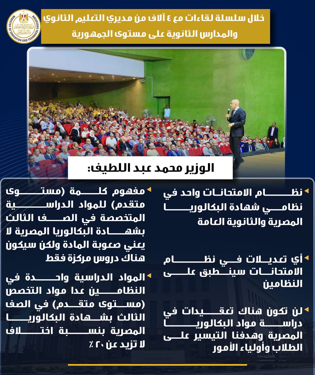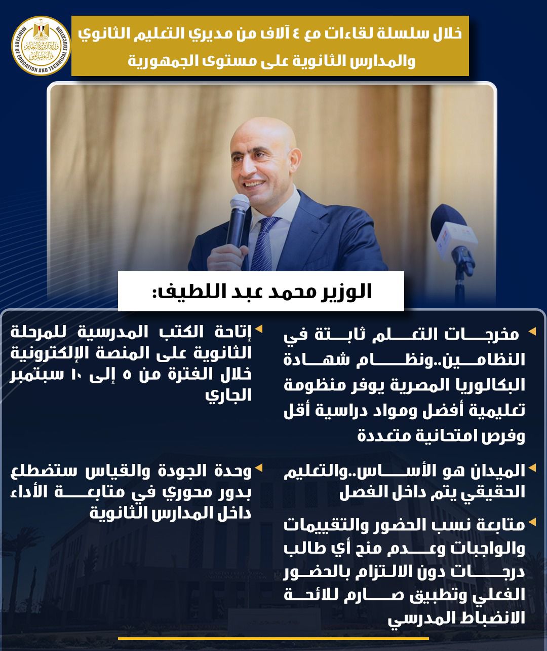 نشرت وزارة التربية والتعليم والتعليم الفني إنفوجرافًا يشمل أبرز تصريحات الوزير محمد عبداللطيف خلال لقاءات ما يقرب من 4 آلاف من مديري المرحلة الثانوية ومديري المدارس الرسمية والرسمية لغات للمرحلة الثانوية على مستوى الجمهورية.