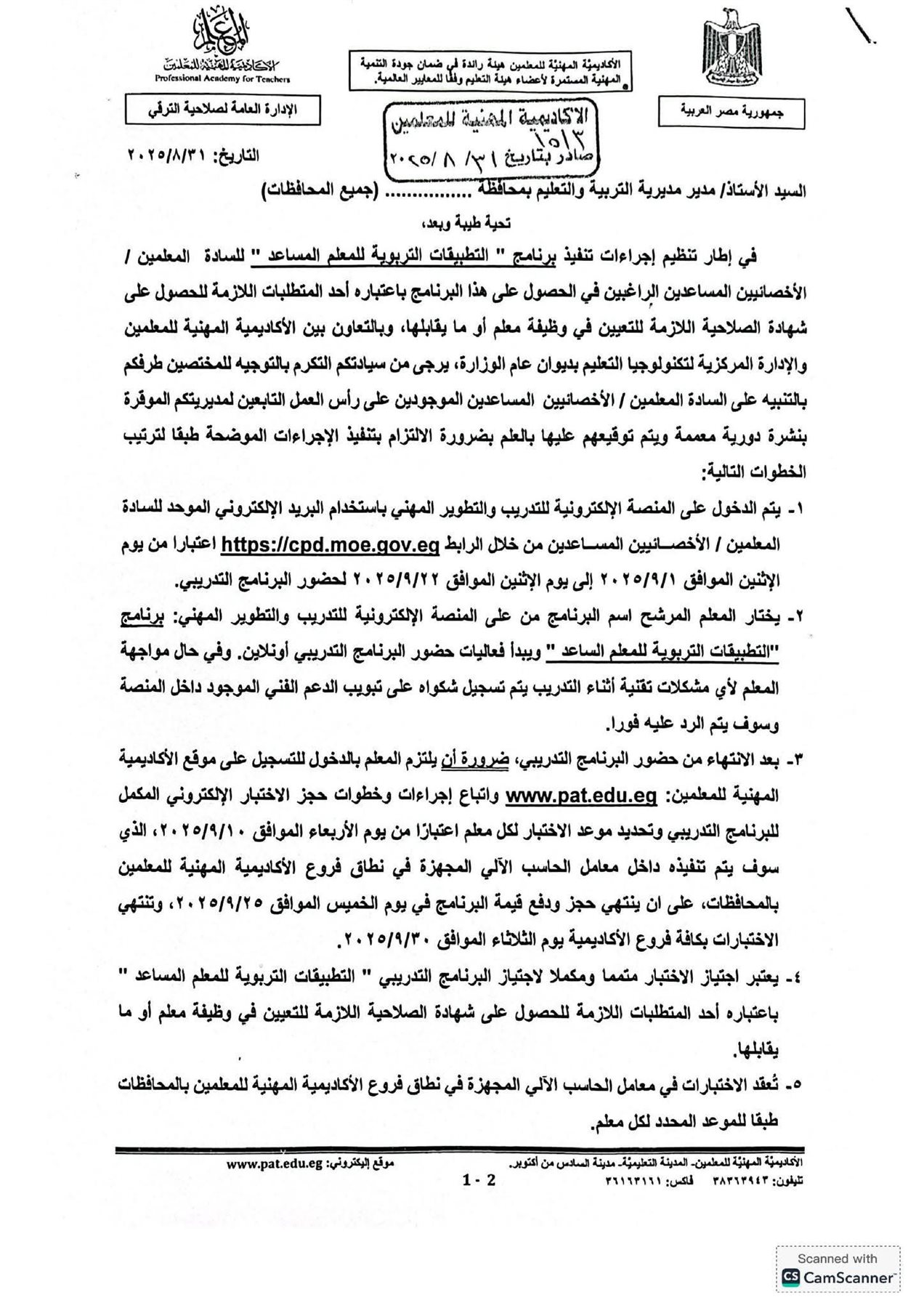 عممت الأكاديمية المهنية للمعلمين خطابا على المديريات التعليمية، أوضحت خلاله أنه في إطار تنظيم إجراءات تنفيذ برنامج " التطبيقات التربوية للمعلم المساعد " لـ المعلمين /الأخصائيين المساعدين الراغبين في الحصول على هذا البرنامج باعتباره أحد المتطلبات اللازمة للحصول على شهادة الصلاحية اللازمة للتعيين في وظيفة معلم أو ما يقابلها.