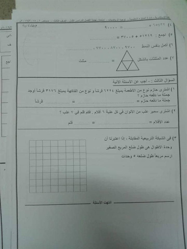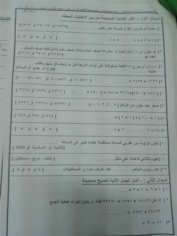 بالصور.. امتحان الرياضيات للصف الثالث الابتدائي بالإسكندرية