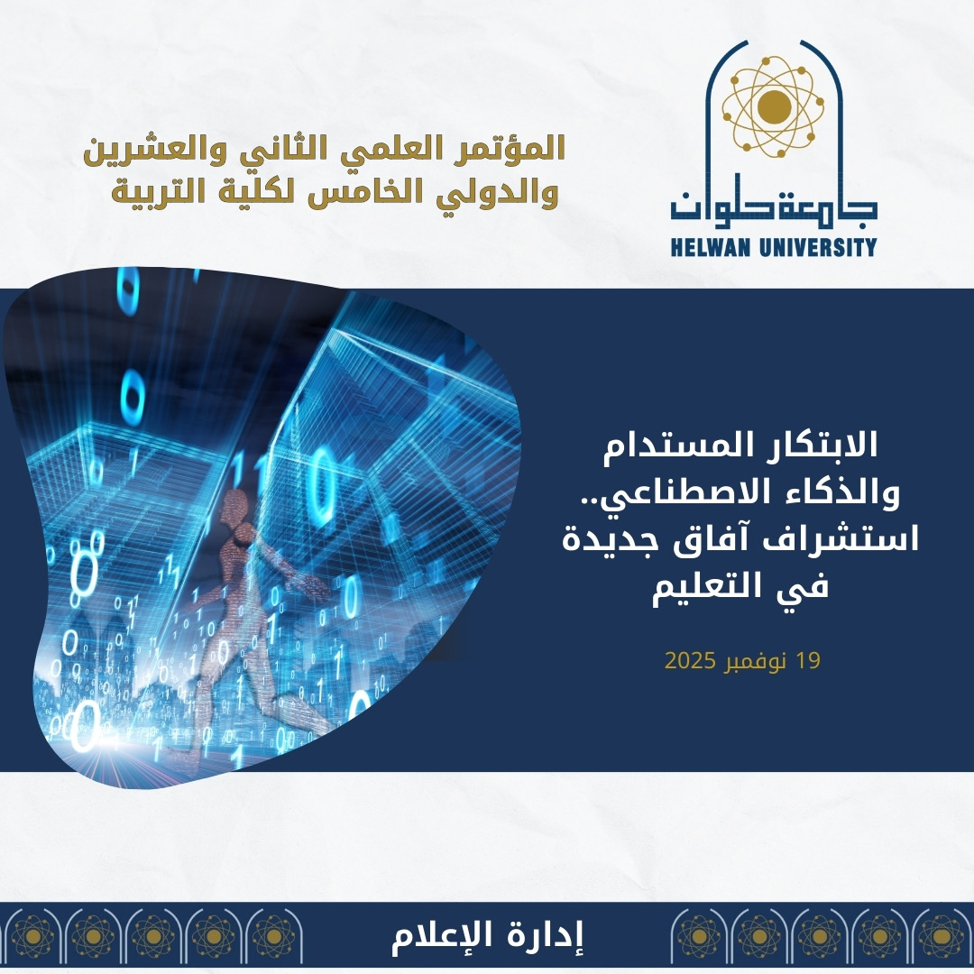 تنظم كلية التربية جامعة حلوان مؤتمرها العلمي الثاني والعشرين والدولي الخامس بعنوان: "الابتكار المستدام والذكاء الاصطناعي.. استشراف آفاق جديدة في التعليم"، وذلك يوم 19 نوفمبر 2025.