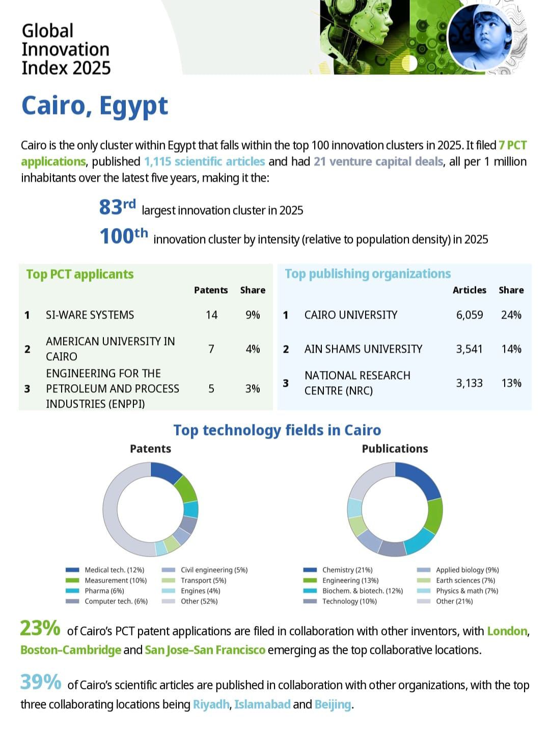 أصدرت المنظمة العالمية للملكية الفكرية WIPO تقرير تجمعات العلوم والتكنولوجيا والابتكار مؤشر الابتكار العالمي لعام 2025، والذي كشف عن تقدم تجمع القاهرة إلى المركز 83 عالميًا ضمن أفضل 100 تجمع للعلوم والتكنولوجيا والابتكار، مقارنة بالمركز 95 في العام الماضي 2024.