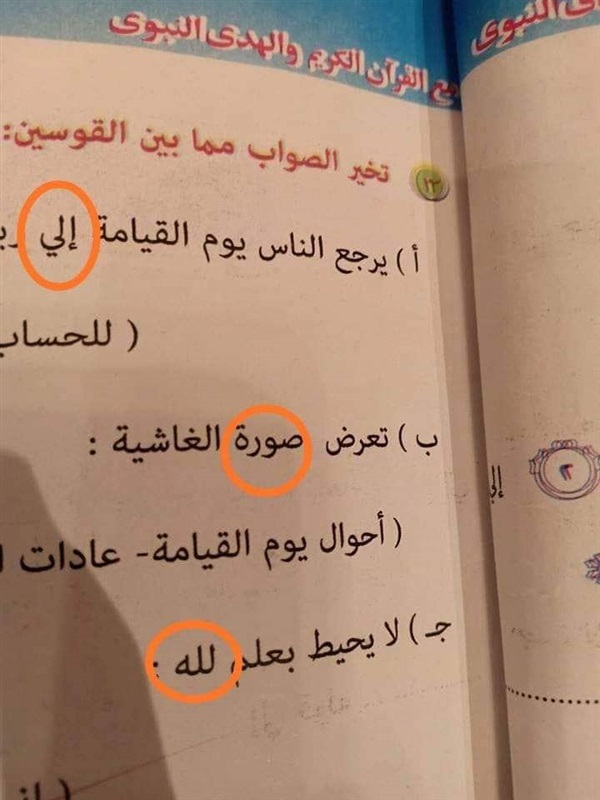 ومن بين الأخطاء التى رصدها عدد من اولياء الأمور حرف الجر "إلى" الذي كتب إلي، وكلمة صورة الغاشية، وتصحيحها سورة الغاشية، بالإضافة الى لفظ الجلالة الذي كتب في التدريبات بعلم لله، بدلا من بعلم الله.