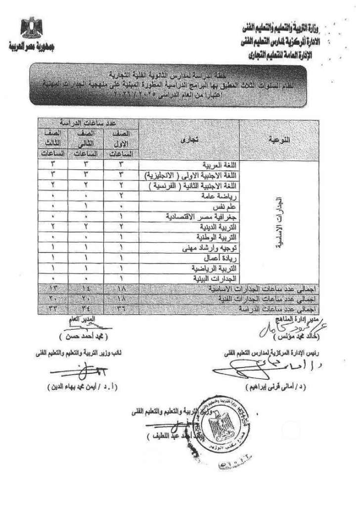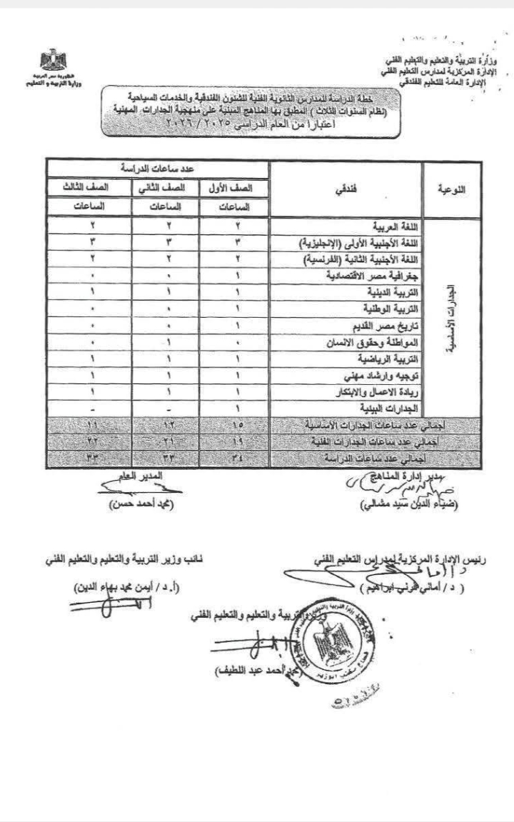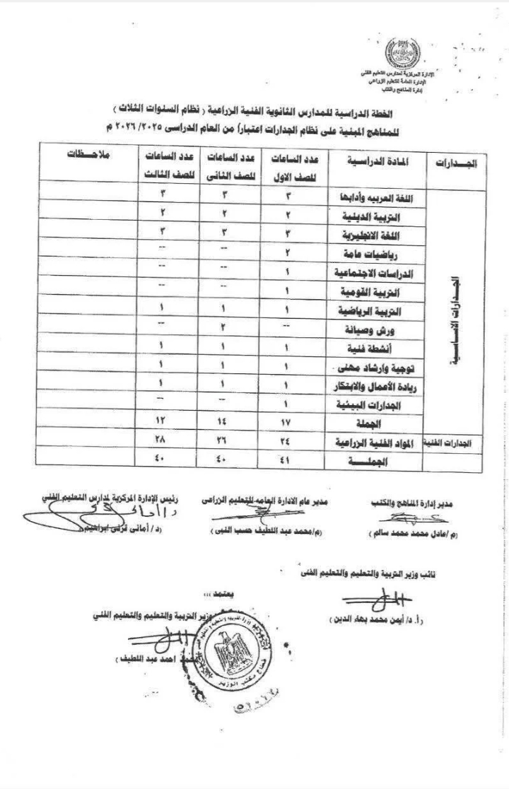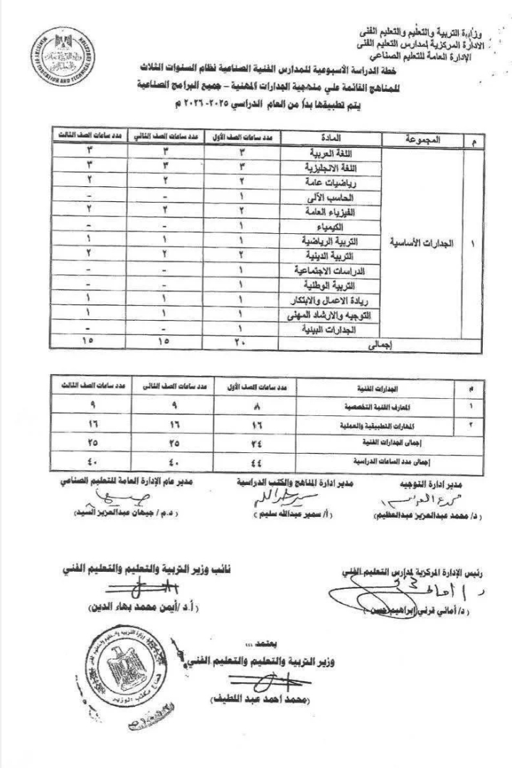 ووجهت وزارة التربية والتعليم، ضرورة التزام جميع مدارس التعليم الفني بها بالخطة الدراسية للفصل الدراسي الأول للعام الدراسي المقبل، وذلك للنظام الثلاث سنوات لجميع النوعيات زراعي وصناعي وتجاري وسياحي لمنهجية الجدارات وعدد ساعات الدراسة وهي:-