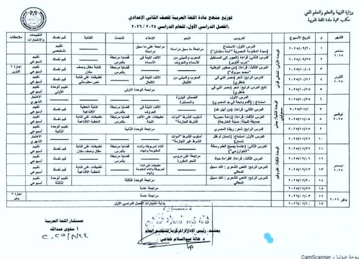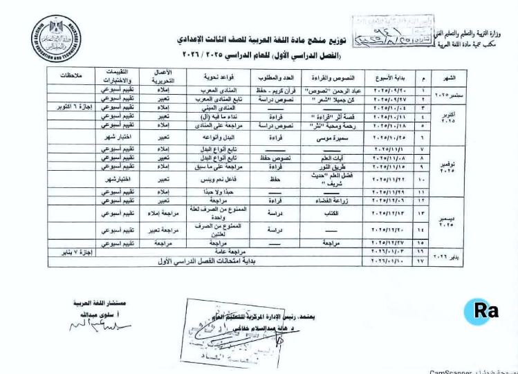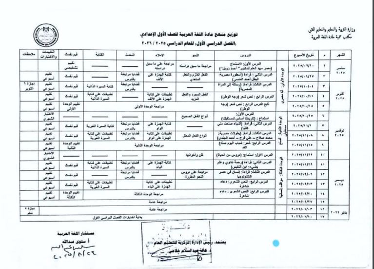 وجاء توزيع منهج اللغة العربية للمرحلة الإعدادية الفصل الدراسي الأول للعام الدراسي المقبل في 2025 - 2026 كالتالي: