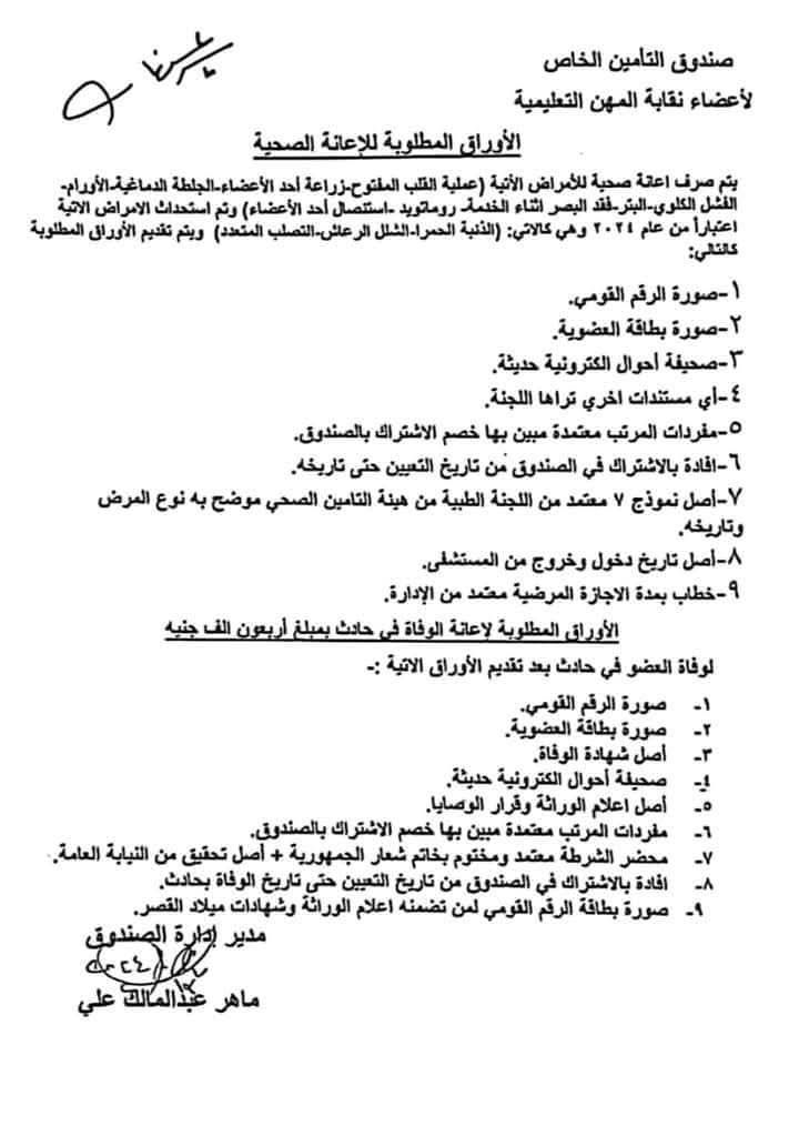 حددت نقابة المهن التعليمية الأوراق المطلوبة لصرف الإعانة الصحية للأمراض الأتية (عملية القلب المفتوح، زراعة أحد الأعضاء، الجلطة الدماغية، الأورام، الفشل الكلوي، البتر، فقد البصر اثناء الخدمة، روماتويد، استئصال أحد الأعضاء وتم استحداث أمراض اعتبارًا من عام ۲۰۲٤ وهي كالآتي: الذنبة الحمرا - الشلل الرعاش، التصلب المتعدد ويتم تقديم الأوراق المطلوبة والتي تضمن الآتي: