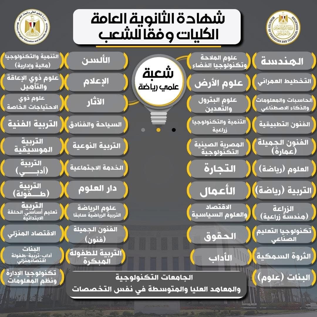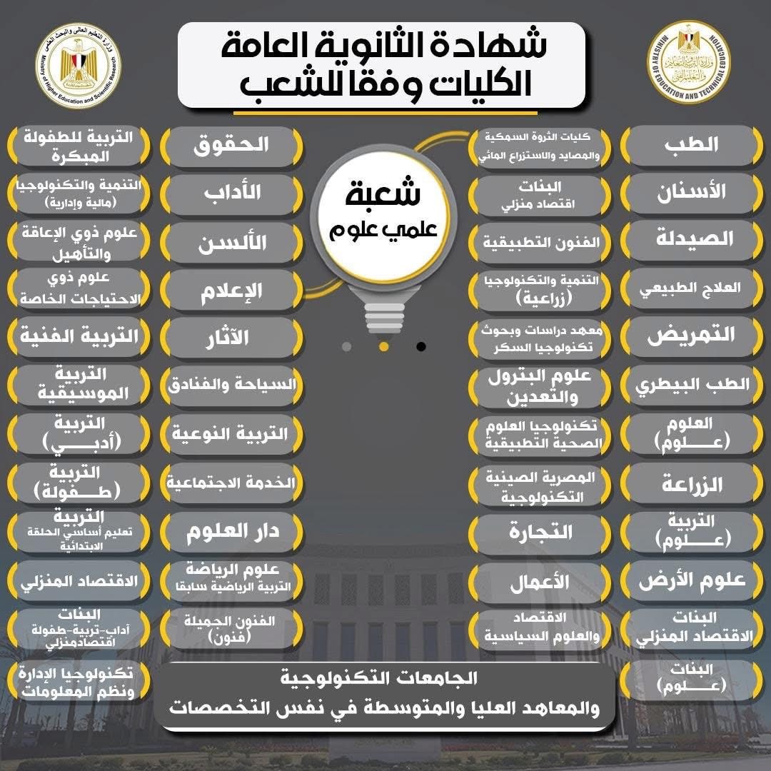 وأشار إلى أنه لن تكون تلك الكليات متاحة لشعبة علمي علوم ولا مسار الطب وعلوم الحياة