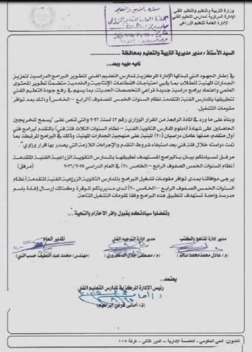 أوضحت وزارة التربية والتعليم والتعليم الفني، في خطاب عممته على المديريات التعليمية، أنه  في إطار الجهود التي تبذلها الإدارة المركزية المدارس التعليم الفني لتطوير البرامج الدراسية لتعزيز الجدارات المهنية للطلاب بما يلبي احتياجات القطاعات الإنتاجية والخدمية متضمنا تطوير المحتوى العلمي واعتماد برامج دراسية جديدة في التخصصات الحديثة بما يسهم في رفع جودة التعليم الفني لتطبيقها بالمدارس الفنية المتقدمة نظام السنوات الخمس للصفوف الرابع - الخامس) وذلك بعد توافر مقومات التشغيل.
