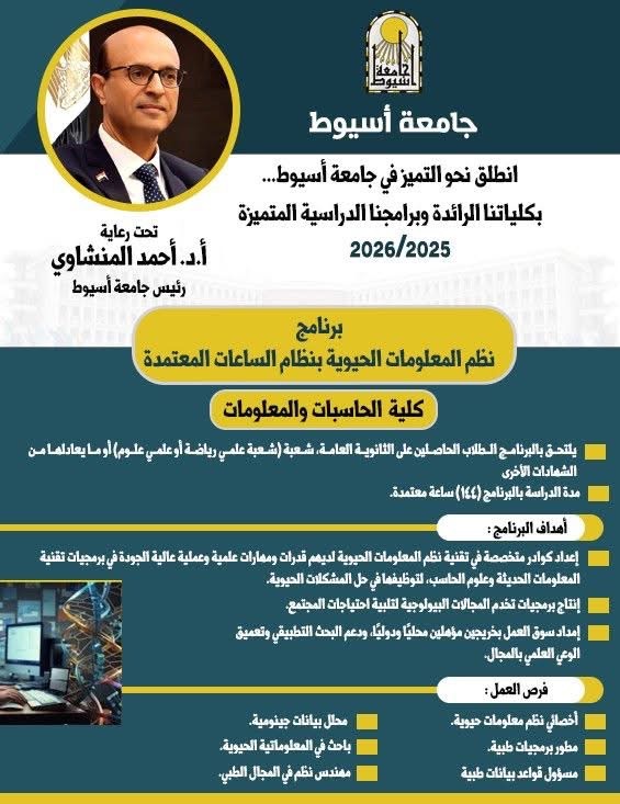 أعلنت كلية الحاسبات والمعلومات جامعة أسيوط، تحت رعاية الدكتور أحمد المنشاوي رئيس جامعة أسيوط، عن إطلاق برنامج جديد بعنوان "نظم المعلومات الحيوية" ضمن برامجها المتميزة للعام الجامعي 2025/2026.