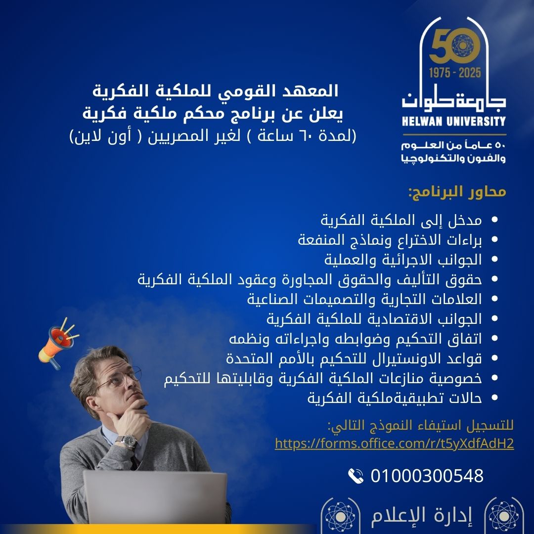 أعلن المعهد القومي للملكية الفكرية جامعة حلوان عن تنظيم برنامج محكم ملكية فكرية لمدة ٦٠ ساعة ويكون نظام التدريب 15 يوم أون لاين، وذلك تحت رعاية الدكتور السيد قنديل رئيس جامعة حلوان، والدكتور ياسر جاد الله عميد المعهد القومي للملكية الفكرية.