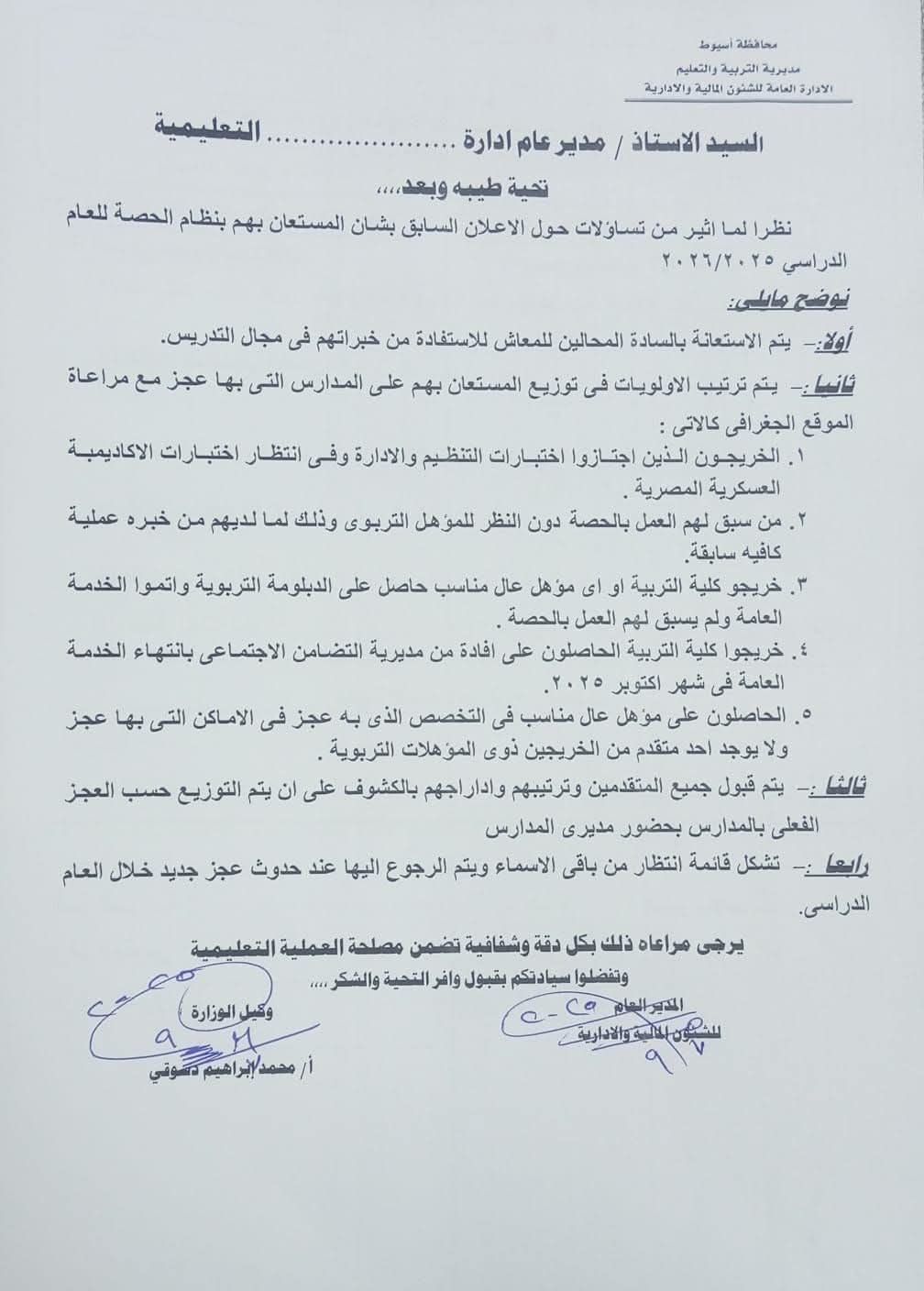 يأتي ذلك نظرا لما أثير من تساؤلات حول الاعلان السابق بشأن المستعان بهم بنظام الحصة للعام الدراسي ۲۰۲٦/٢٠٢٥