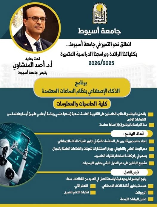 أعلنت كلية الحاسبات والمعلومات جامعة أسيوط، تحت رعاية الدكتور أحمد المنشاوي رئيس الجامعة، عن طرح برنامج "الذكاء الاصطناعي" بنظام الساعات المعتمدة للعام الجامعي 2025/2026، وذلك في إطار حرص الجامعة على التوسع في تقديم برامج نوعية متميزة تواكب متطلبات سوق العمل المحلي والإقليمي والدولي، وتدعم توجه الدولة نحو تعزيز التحول الرقمي وبناء الاقتصاد المعرفي.