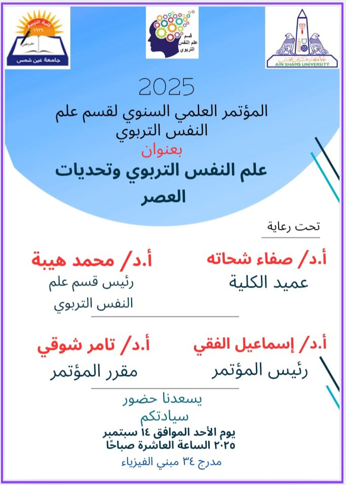 تنظم كلية التربية جامعة عين شمس، يوم الأحد الموافق 14 سبتمبر 2025، المؤتمر العلمي السنوي لقسم علم النفس التربوي تحت عنوان: "علم النفس التربوي وتحديات العصر"، وذلك برعاية الدكتورة صفاء شحاتة عميد كلية التربية جامعة عين شمس، والدكتور محمد هِيبة رئيس قسم علم النفس التربوي، والدكتور إسماعيل الفقي رئيس المؤتمر، والدكتور تامر شوقي مقرر المؤتمر.