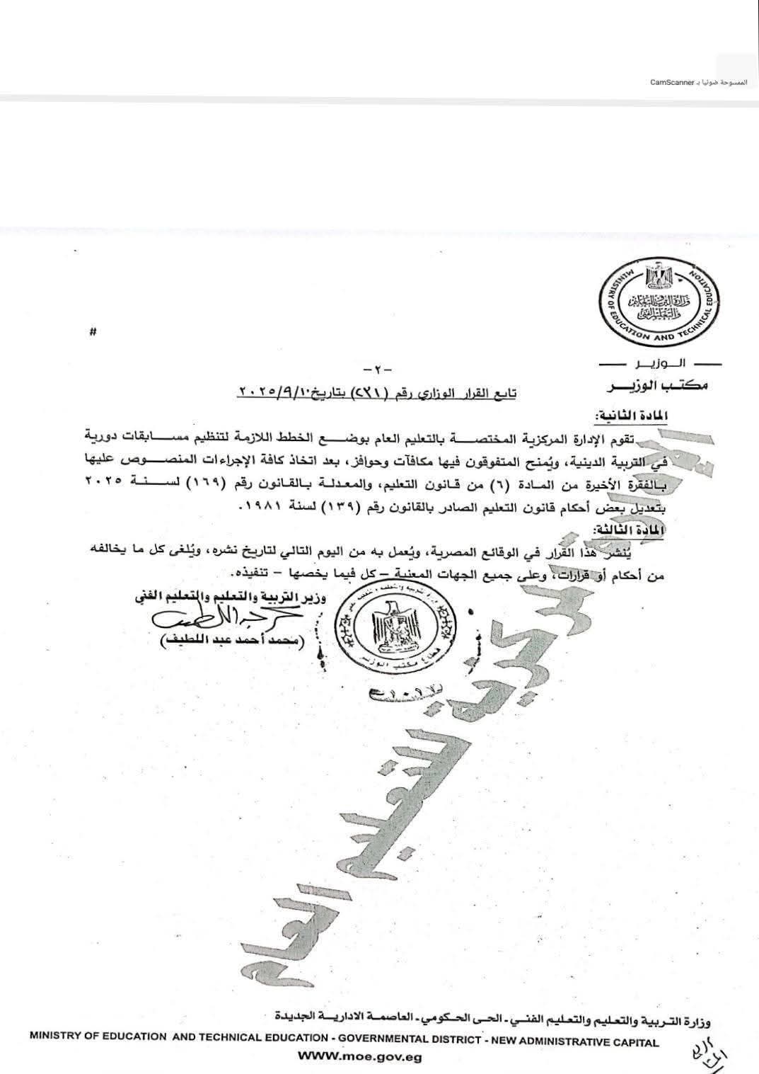 ووجهت الإدارة المركزية المختصة بالتعليم العام بوضع الخطط اللازمة لتنظيم مسابقات دورية في التربية الدينية، ويمنح المتفوقون فيها مكافآت وحوافز، بعد اتخاذ كافة الإجراءات المنصوص عليها بالفقرة الأخيرة من المادة (1) من قانون التعليم، والمعدلة بالقانون رقم (١٦٩) لسنة ٢٠٢٥ بتعديل بعض أحكام قانون التعليم الصادر بالقانون رقم (۱۳۹) لسنة ۱۹۸۱.