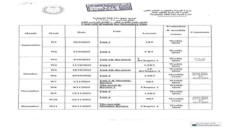 وأوضحت وزارة التربية والتعليم توزيع منهج الصف الأول الثانوي للغة الإنجليزية الفصل الدراسي الأول خلال شهر «سبتمبر وأكتوبر ونوفمبر وديسمبر» ومواعيد التقييمات الأسبوعية والاختبارات الأسبوعية.