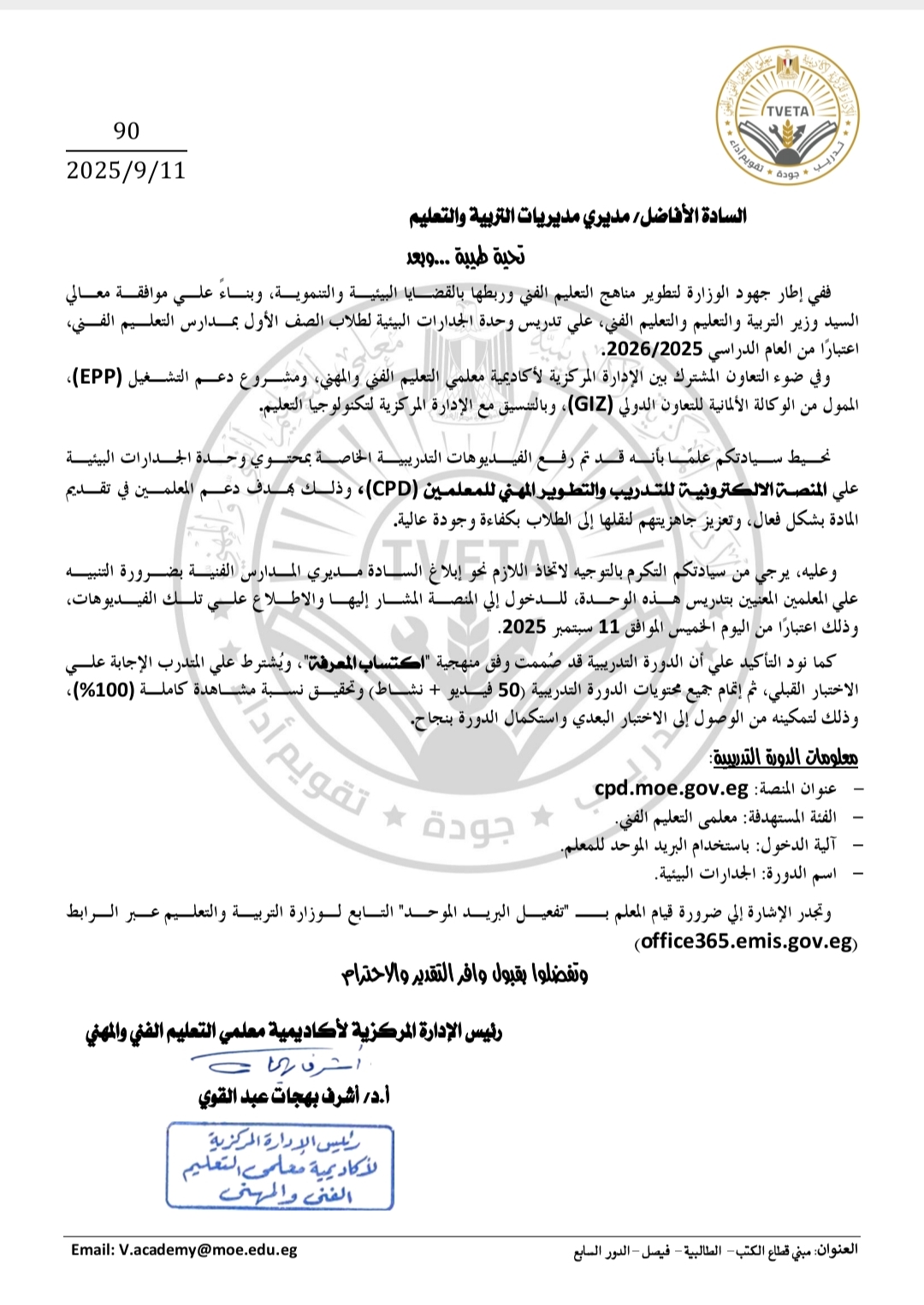 ووجهت باتخاذ اللازم نحو إبلاغ  مديري المدارس الفنية بضرورة التنبيه على المعلمين المعنيين بتدريس هذه الوحدة، للدخول إلى المنصة المشار إليها والاطلاع علي تلك الفيديوهات،  وذلك اعتبارًا من اليوم الخميس الموافق 11 سبتمبر 2025.