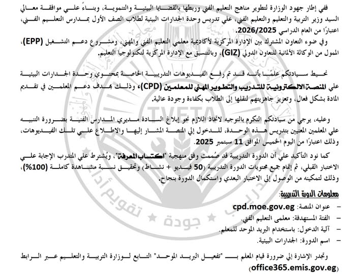 وأهاب الوزارة بمديري المدارس الفنية بضرورة التنبية على المعلمين المعنيين بتدريس هذه الوحدة الدخول على المنصة المشار إليها والاطلاع على تلك الفديوهات من خلال رابط منصة التدريب