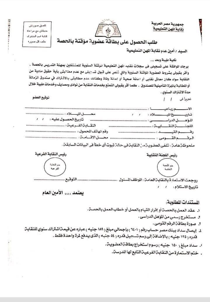 أعدت نقابة المهن التعليمية، استمارة خاصة لاشتراك معلمي الحصة فى النقابة كعضوية موقتة.